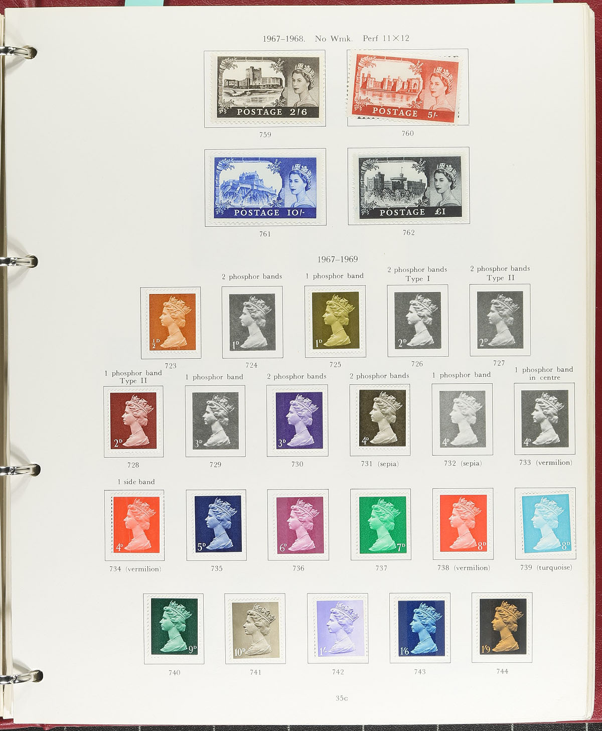 Collection of mint and used Great Britain, 1841-1988, containing many hundreds of stamps in a Stanley Gibbons album. The collection ranges from Scott #3/1238, including roughly 30 Victorain issues, along with singles, sets, and partial sets, noting a few better issues with #s 3, 27, 34, 51, 64, along with a few other stamps cataloguing $20 and up. The collection primarily contains used stamps up to 1935, with a mixture of mint and used to 1970s, with primarily never hinged singles and sets thereafter. A nice starter collection from this popular collecting country, overall fine to very fine. Estimate =