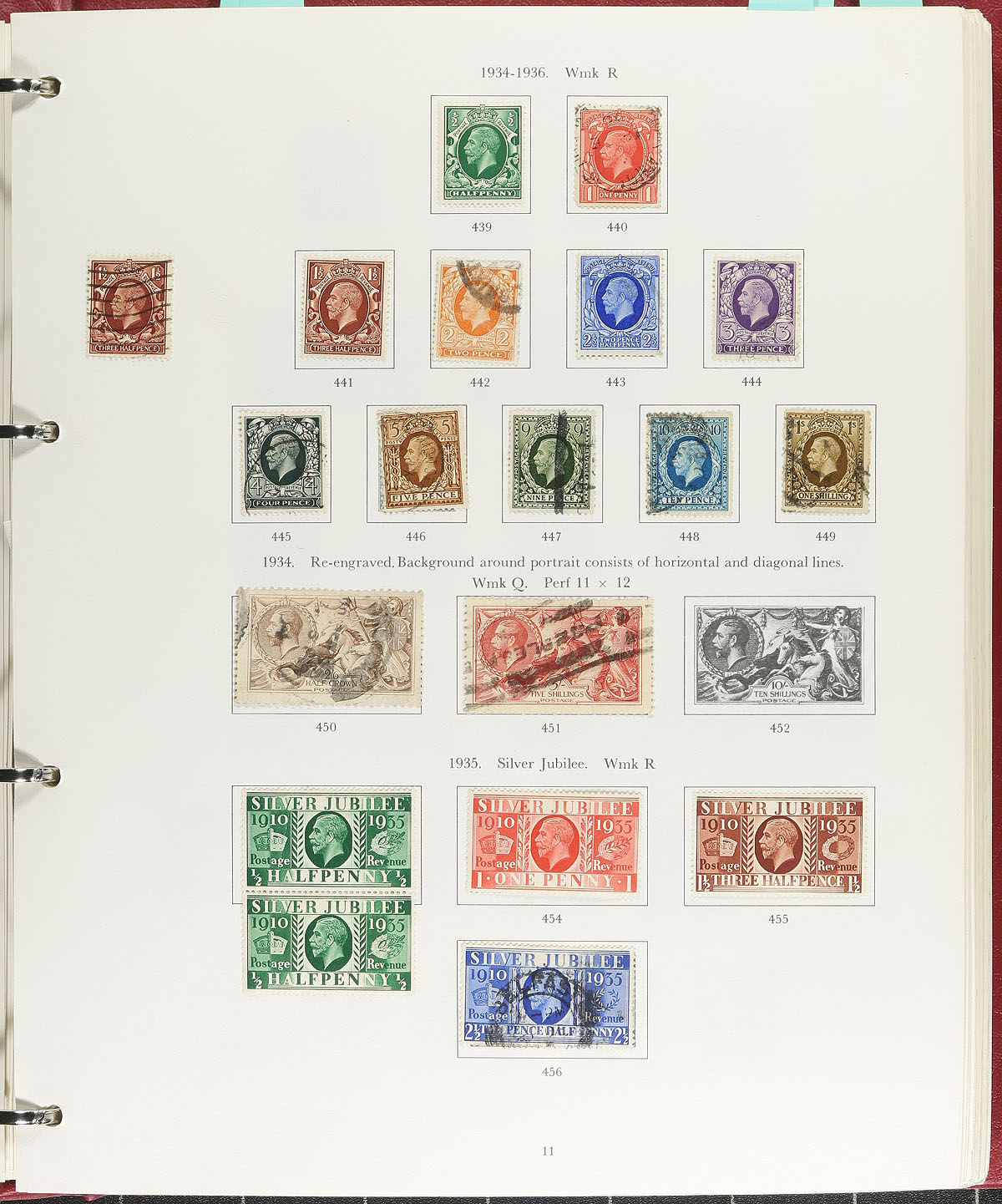 Collection of mint and used Great Britain, 1841-1988, containing many hundreds of stamps in a Stanley Gibbons album. The collection ranges from Scott #3/1238, including roughly 30 Victorain issues, along with singles, sets, and partial sets, noting a few better issues with #s 3, 27, 34, 51, 64, along with a few other stamps cataloguing $20 and up. The collection primarily contains used stamps up to 1935, with a mixture of mint and used to 1970s, with primarily never hinged singles and sets thereafter. A nice starter collection from this popular collecting country, overall fine to very fine. Estimate =