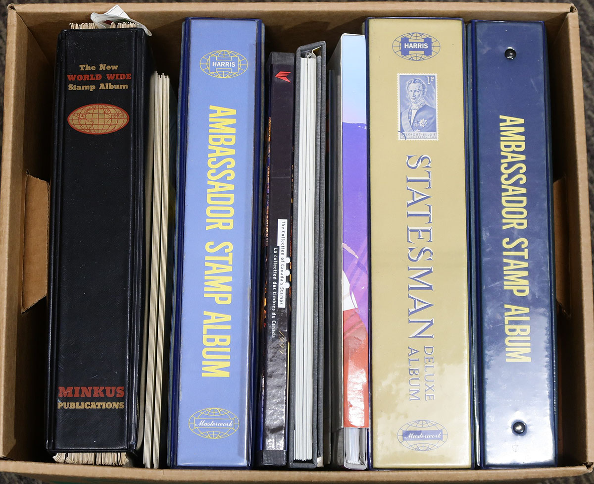 Consignment remainders of thousands of used worldwide stamps filling a bankers box. The lot contains the majority of material in 3 Harris and a Minkus album, generally containing stamps from A to I countries, with special consideration given to Canada (including post-2000 issues), along with France, Germany, and other European countries. The lot also includes a few Canada annual collections (noting 2000 Millenium, and from 1999), and the postage stamps from China 2010. A few faults noted, still a nice lot for the Canada and worldwide collector. Estimate =