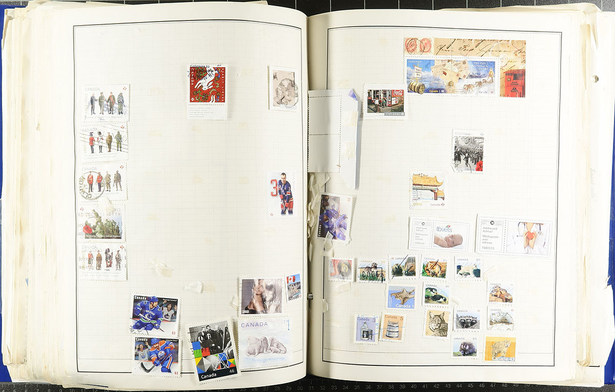 Consignment remainders of thousands of used worldwide stamps filling a bankers box. The lot contains the majority of material in 3 Harris and a Minkus album, generally containing stamps from A to I countries, with special consideration given to Canada (including post-2000 issues), along with France, Germany, and other European countries. The lot also includes a few Canada annual collections (noting 2000 Millenium, and from 1999), and the postage stamps from China 2010. A few faults noted, still a nice lot for the Canada and worldwide collector. Estimate =