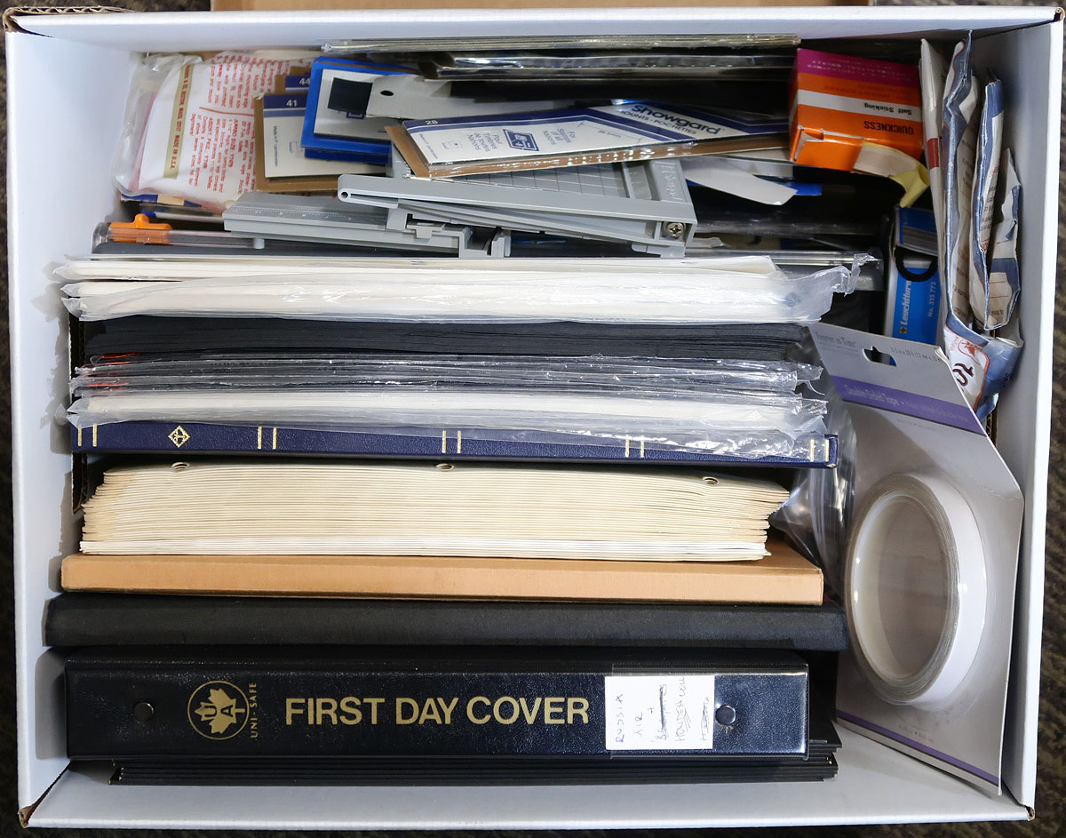 Nice grouping of useful supplies in a box, including 3 stockbooks (some stamps inside), several manila stock pages, 9 packs of Vario-style stock pages in various configurations (almost all still unopened and sealed), many stamps mounts with guillotine, along with various other supplies. Gently used to brand new condition and still useful for the new owner. Estimate =