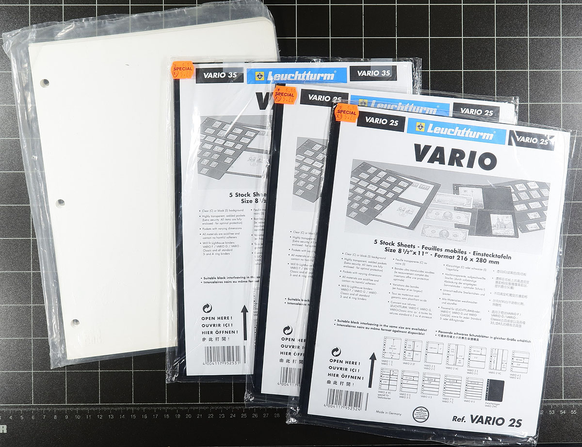 Nice grouping of useful supplies in a box, including 3 stockbooks (some stamps inside), several manila stock pages, 9 packs of Vario-style stock pages in various configurations (almost all still unopened and sealed), many stamps mounts with guillotine, along with various other supplies. Gently used to brand new condition and still useful for the new owner. Estimate =