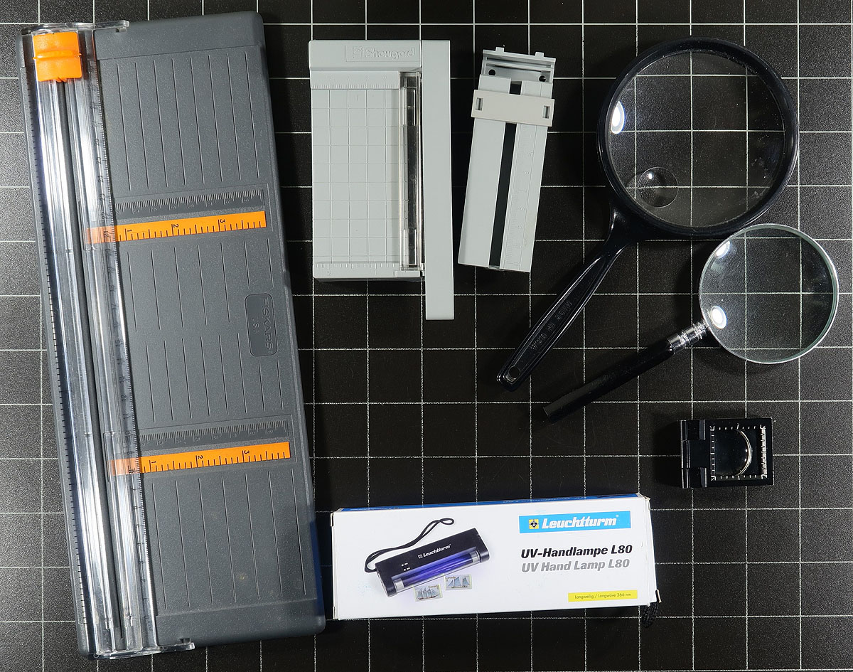 Nice grouping of useful supplies in a box, including 3 stockbooks (some stamps inside), several manila stock pages, 9 packs of Vario-style stock pages in various configurations (almost all still unopened and sealed), many stamps mounts with guillotine, along with various other supplies. Gently used to brand new condition and still useful for the new owner. Estimate =
