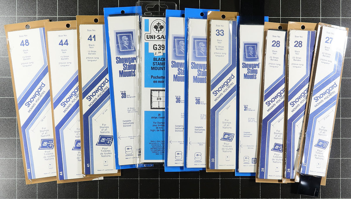 Nice grouping of useful supplies in a box, including 3 stockbooks (some stamps inside), several manila stock pages, 9 packs of Vario-style stock pages in various configurations (almost all still unopened and sealed), many stamps mounts with guillotine, along with various other supplies. Gently used to brand new condition and still useful for the new owner. Estimate =
