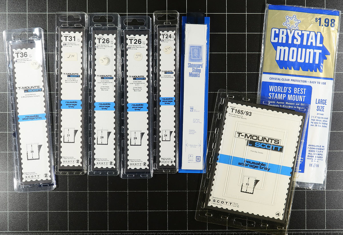 Nice grouping of useful supplies in a box, including 3 stockbooks (some stamps inside), several manila stock pages, 9 packs of Vario-style stock pages in various configurations (almost all still unopened and sealed), many stamps mounts with guillotine, along with various other supplies. Gently used to brand new condition and still useful for the new owner. Estimate =