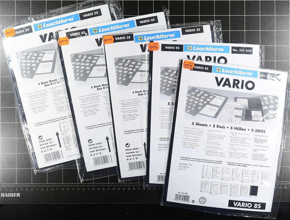 Nice grouping of useful supplies in a box, including 3 stockbooks (some stamps inside), several manila stock pages, 9 packs of Vario-style stock pages in various configurations (almost all still unopened and sealed), many stamps mounts with guillotine, along with various other supplies. Gently used to brand new condition and still useful for the new owner. Estimate =