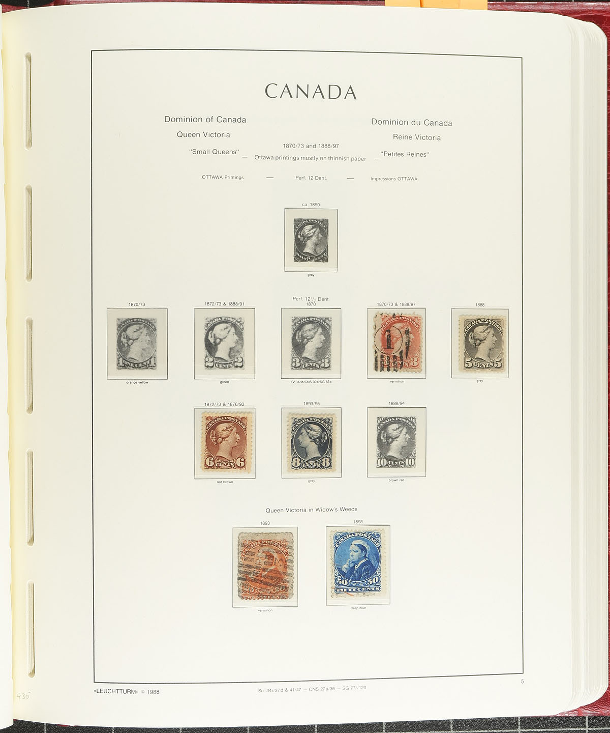 Comprehensive collection of mint and used Canada and BNA, 1859-1980, containing many hundreds of stamps in a lovely Lighthouse hingeless album with slipcase. The Canada collection ranges from Scott #15/877, but essentially begins with a small selection of mint and used Small Queens, a few mint Jubilees (including 8c, nh, with small crease in lower corner), and continues with mint and or used partial sets of Leafs, Numerals, and Edwards. The collection then predominantly becomes a mint collection with partial sets of Quebecs, Admirals, Scrolls and Arch issues, with the majority of stamps thereafter being never hinged including sets of Medallions (c.v. $279 total), 1935 Pictorials ($182 total), and War issues ($180 total). Just a few of the better stamps include Scott #s 100 (nh, $475), 115, 117, 119 (all nh, $540 total), 157 (nh, $120), C1-C4 (nh, $224 total), along with singles and sets cataloguing $20 to $40 and up. Owner's Scott 2026 catalogue value for Canada totals $10,961.00. The collection also includes roughly 250 BNA stamps with strength in Newfoundland, containing roughly 200 stamps in total, with singles, sets, and partial sets from 1865 to 1947, including a few airmail issues, noting Scott #183-199 (c.v. $133 total), along with some material cataloguing $20 and up. Owner's Scott 2026 catalogue value for the BNA stamps totals $5,631. Total 2026 catalogue value for the entire collection is $16,592. A lovely opportunity to build a classic Canada collection. A few small faults with a few of the early stamps, including a few having no gum, overall fine to very fine. Total catalogue value US$16,592.00 ($22,399.20 CDN). Estimate =
