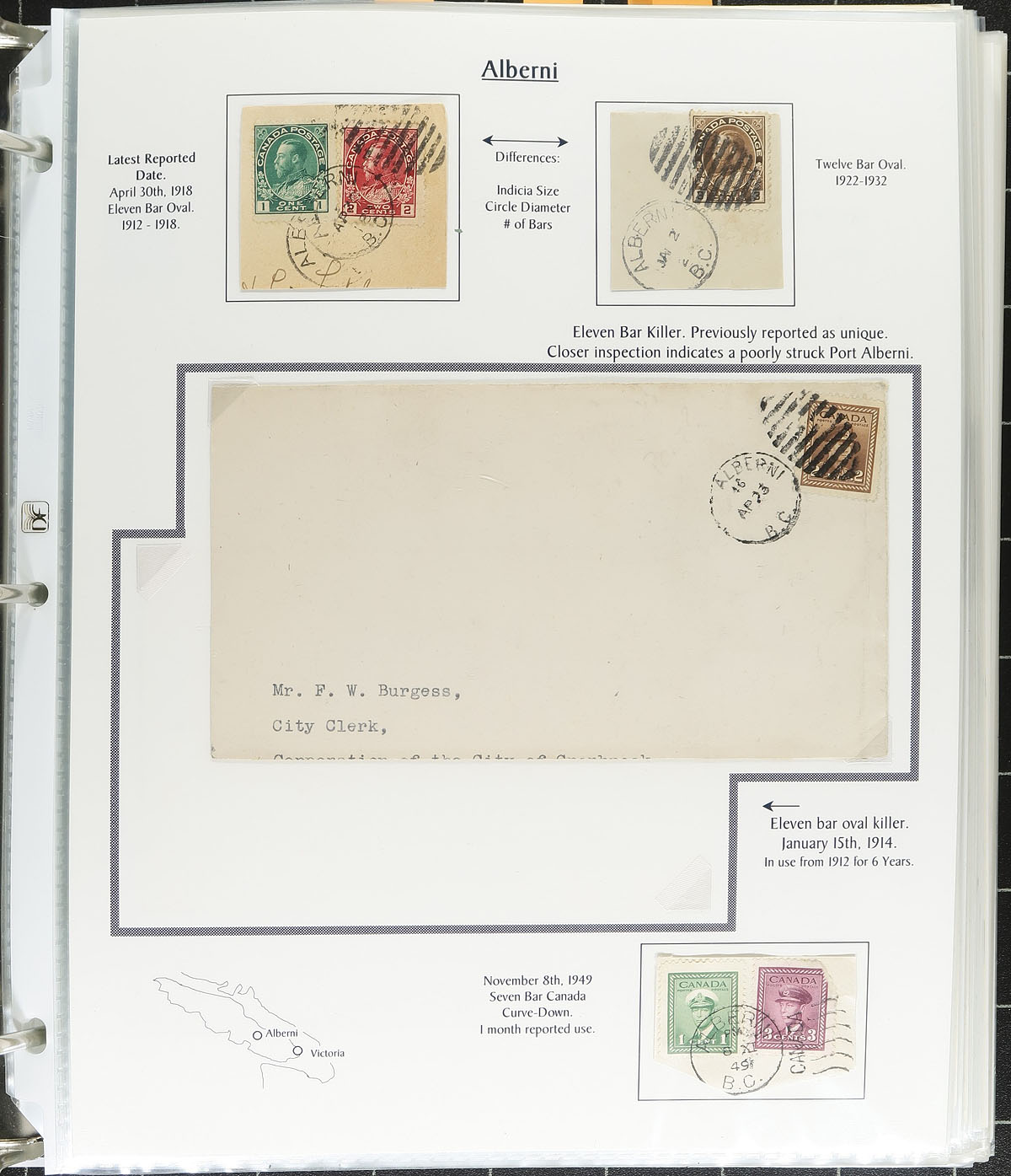 Lovely collection of British Columbia Duplex Postmarks in 3 volumes. The collection contains a few hundred stamps (on and off piece), covers, cards, and more from over 100 different towns ranging from A (Abbottsford) to Y (Youbou), and includes better items noting earliest and latest known hammers, various indicia sizes, hammer types, etc. A few of the towns include Fraser Mills, Hollyburn, Movie, Gibsons Landing, Skookumchuck, and more, with each town having at least one duplex item. A lovely collection that should be continued, with online photos showing a sampling. Estimate =