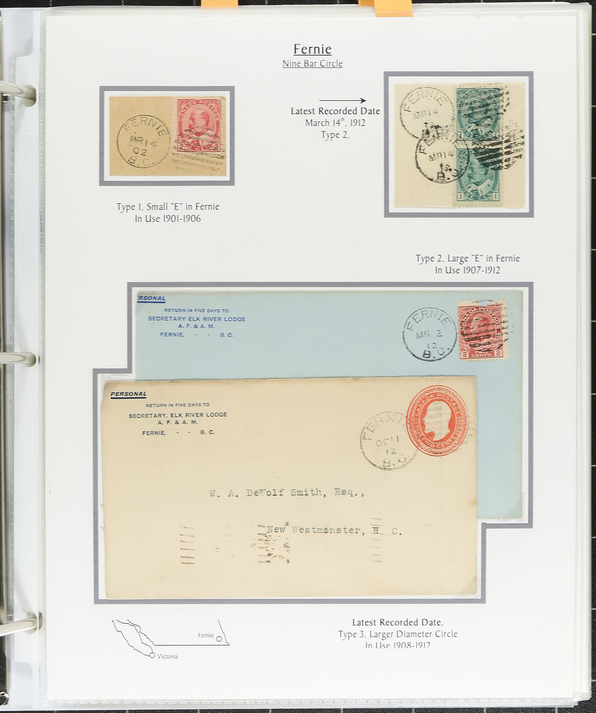 Lovely collection of British Columbia Duplex Postmarks in 3 volumes. The collection contains a few hundred stamps (on and off piece), covers, cards, and more from over 100 different towns ranging from A (Abbottsford) to Y (Youbou), and includes better items noting earliest and latest known hammers, various indicia sizes, hammer types, etc. A few of the towns include Fraser Mills, Hollyburn, Movie, Gibsons Landing, Skookumchuck, and more, with each town having at least one duplex item. A lovely collection that should be continued, with online photos showing a sampling. Estimate =