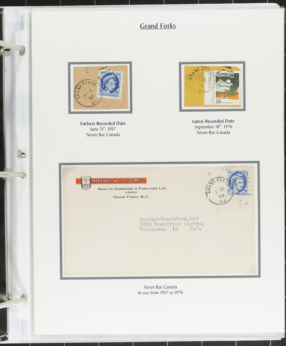 Lovely collection of British Columbia Duplex Postmarks in 3 volumes. The collection contains a few hundred stamps (on and off piece), covers, cards, and more from over 100 different towns ranging from A (Abbottsford) to Y (Youbou), and includes better items noting earliest and latest known hammers, various indicia sizes, hammer types, etc. A few of the towns include Fraser Mills, Hollyburn, Movie, Gibsons Landing, Skookumchuck, and more, with each town having at least one duplex item. A lovely collection that should be continued, with online photos showing a sampling. Estimate =