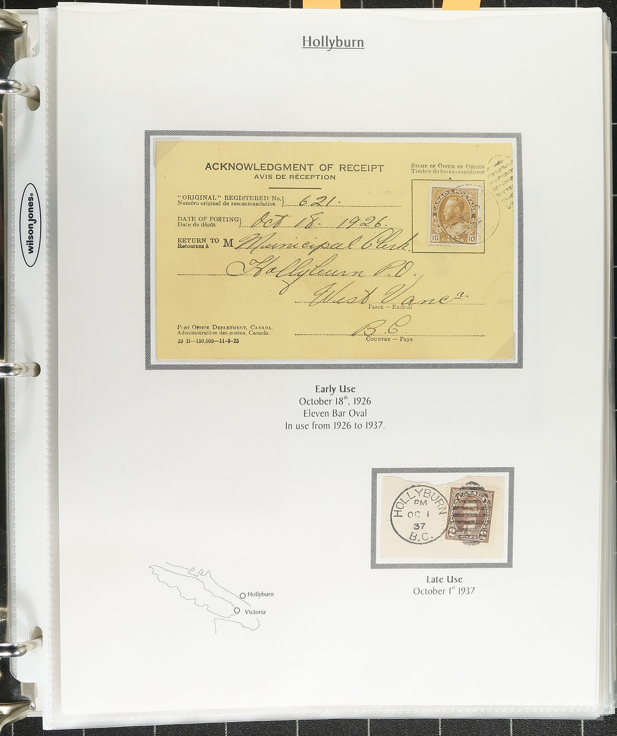 Lovely collection of British Columbia Duplex Postmarks in 3 volumes. The collection contains a few hundred stamps (on and off piece), covers, cards, and more from over 100 different towns ranging from A (Abbottsford) to Y (Youbou), and includes better items noting earliest and latest known hammers, various indicia sizes, hammer types, etc. A few of the towns include Fraser Mills, Hollyburn, Movie, Gibsons Landing, Skookumchuck, and more, with each town having at least one duplex item. A lovely collection that should be continued, with online photos showing a sampling. Estimate =
