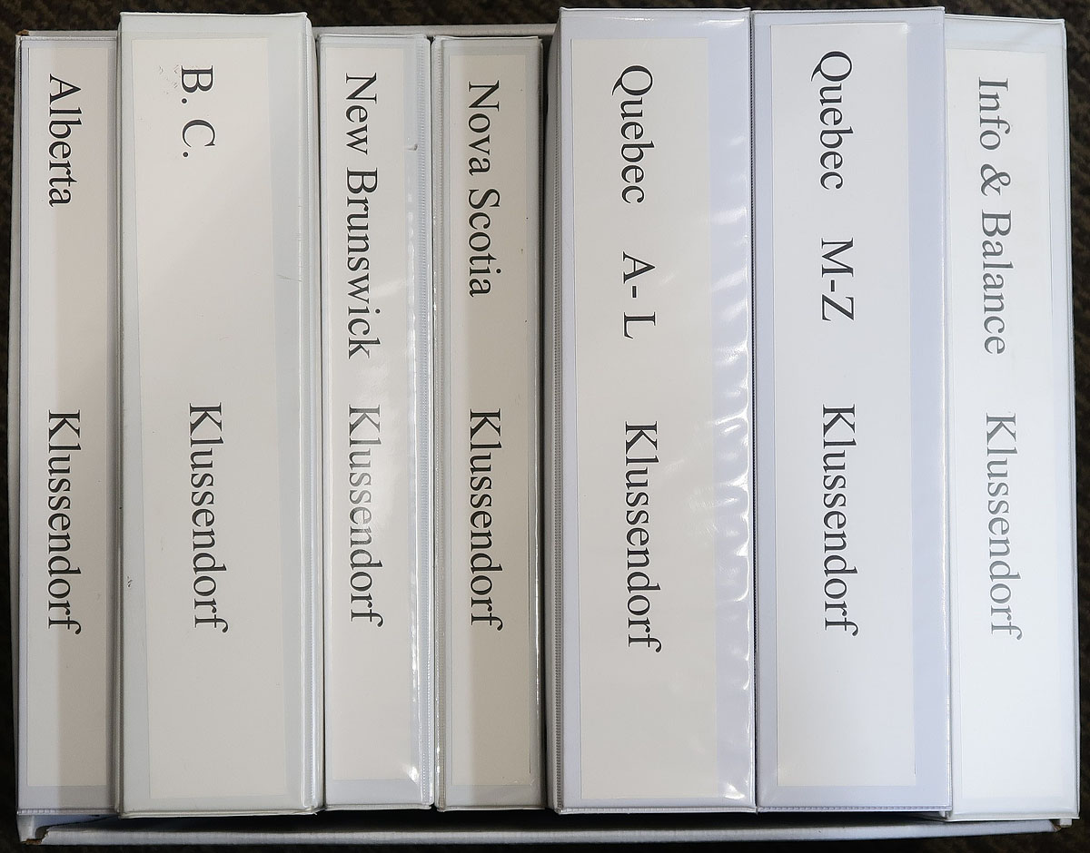 Interesting collection of Klussendorf postmarks in 6 binders, containing many hundreds of covers and some material on piece, generally ranging from the mid 1980's to the mid 1990's. The collection has better representation from Quebec in 2 thick binders, covering towns from A to Z, along with a thick binder of British Columbia, along with smaller representation from Alberta, Nova Scotia, and New Brunswick, with each town generally having 4 to 10 covers each (noting various frankings and rates), and includes slogans, inverted slugs, and date errors for some postmarks. The collection also includes a binder of cancel information which includes earliest known dates, known time marks, serial numbers, and more. A nice starter collection and a nice start to a potential exhibit. Estimate =