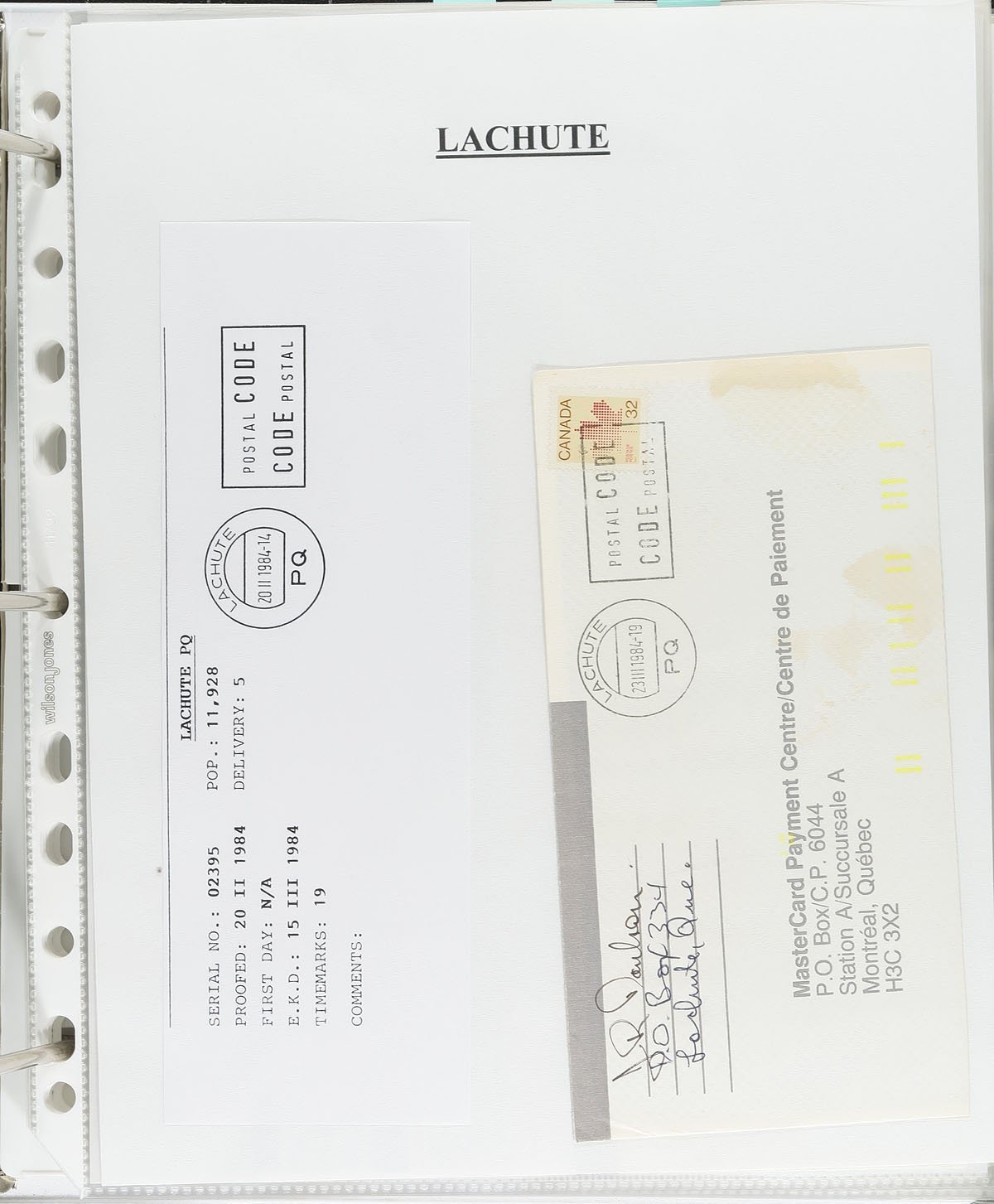 Interesting collection of Klussendorf postmarks in 6 binders, containing many hundreds of covers and some material on piece, generally ranging from the mid 1980's to the mid 1990's. The collection has better representation from Quebec in 2 thick binders, covering towns from A to Z, along with a thick binder of British Columbia, along with smaller representation from Alberta, Nova Scotia, and New Brunswick, with each town generally having 4 to 10 covers each (noting various frankings and rates), and includes slogans, inverted slugs, and date errors for some postmarks. The collection also includes a binder of cancel information which includes earliest known dates, known time marks, serial numbers, and more. A nice starter collection and a nice start to a potential exhibit. Estimate =