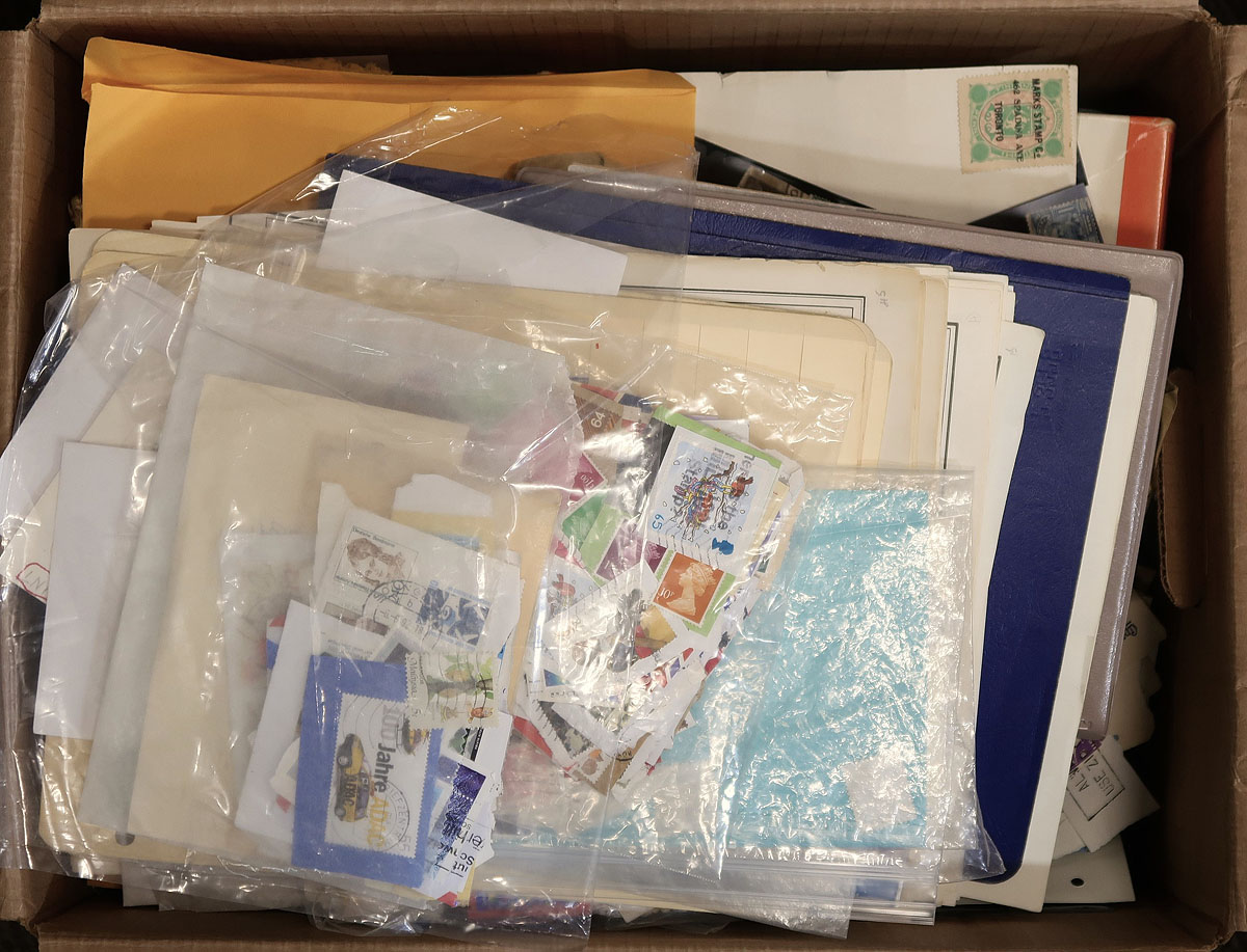 Hoard of thousands of worldwide stamps stuffing a carton in a wide variety of formats including stockbooks and album pages, glassines, envelopes, and loose stamps in boxes just to name a few. A cursory glance indicated material from the late 1890's up to modern day, noting better representation from Europe and North America, but no real organization to the lot at all. A nice project for the worldwide collector and sorter. Estimate =