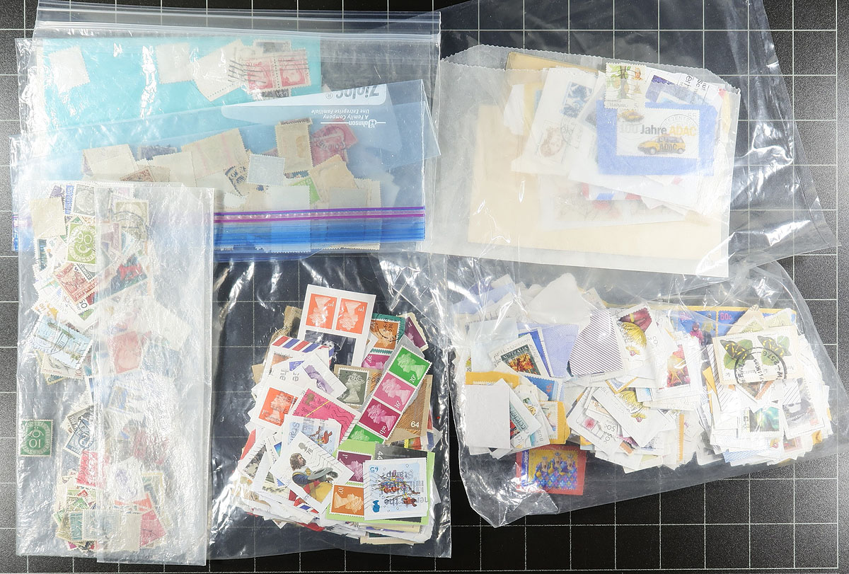 Hoard of thousands of worldwide stamps stuffing a carton in a wide variety of formats including stockbooks and album pages, glassines, envelopes, and loose stamps in boxes just to name a few. A cursory glance indicated material from the late 1890's up to modern day, noting better representation from Europe and North America, but no real organization to the lot at all. A nice project for the worldwide collector and sorter. Estimate =