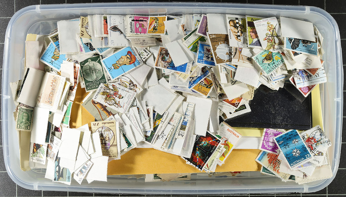 Hoard of thousands of worldwide stamps stuffing a carton in a wide variety of formats including stockbooks and album pages, glassines, envelopes, and loose stamps in boxes just to name a few. A cursory glance indicated material from the late 1890's up to modern day, noting better representation from Europe and North America, but no real organization to the lot at all. A nice project for the worldwide collector and sorter. Estimate =