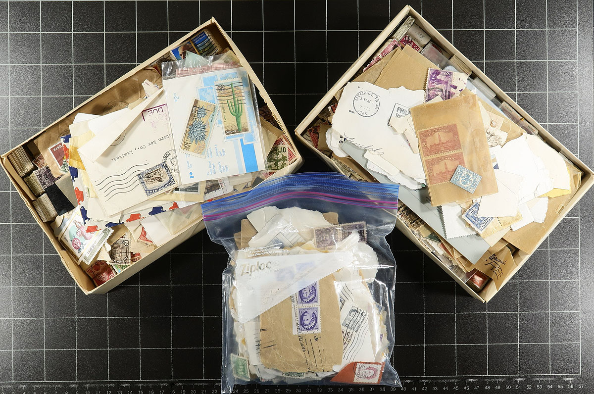 Hoard of thousands of worldwide stamps stuffing a carton in a wide variety of formats including stockbooks and album pages, glassines, envelopes, and loose stamps in boxes just to name a few. A cursory glance indicated material from the late 1890's up to modern day, noting better representation from Europe and North America, but no real organization to the lot at all. A nice project for the worldwide collector and sorter. Estimate =