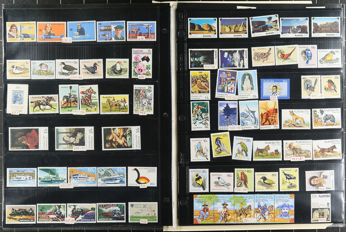 Nice accumulation of primarily never hinged Australia, 1950's-1990's, containing many hundreds of stamps in roughly 20 stock pages. The lot generally ranges from Scott #311/1435, containing singles and primarily sets, with a spot check indicating material cataloguing $5 to $10 each. Owner's 2013 Scott catalogue value for the lot totals US$878.00, face value alone would be at least a few hundred dollars. A nice clean lot for collectors and dealers alike. Estimate =