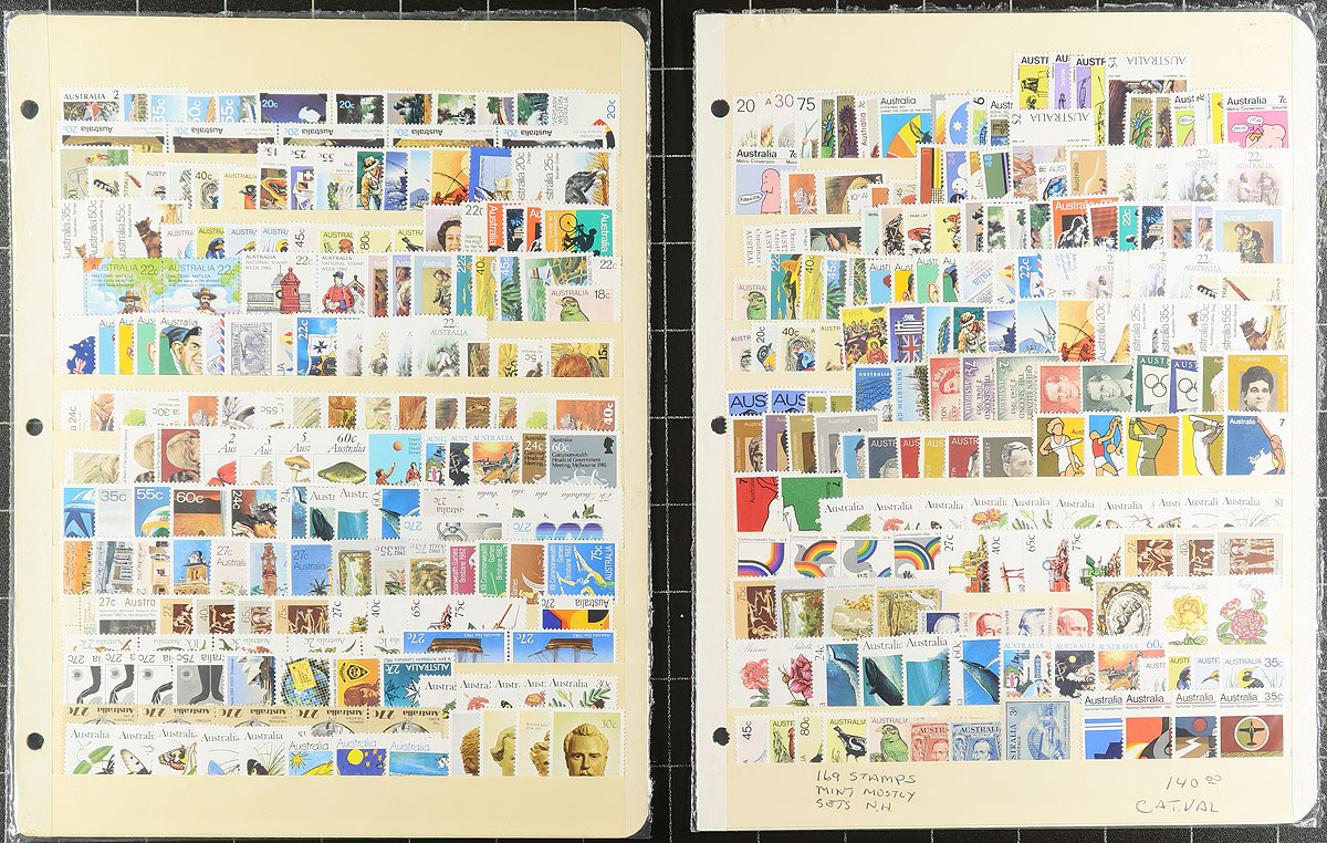 Nice accumulation of primarily never hinged Australia, 1950's-1990's, containing many hundreds of stamps in roughly 20 stock pages. The lot generally ranges from Scott #311/1435, containing singles and primarily sets, with a spot check indicating material cataloguing $5 to $10 each. Owner's 2013 Scott catalogue value for the lot totals US$878.00, face value alone would be at least a few hundred dollars. A nice clean lot for collectors and dealers alike. Estimate =