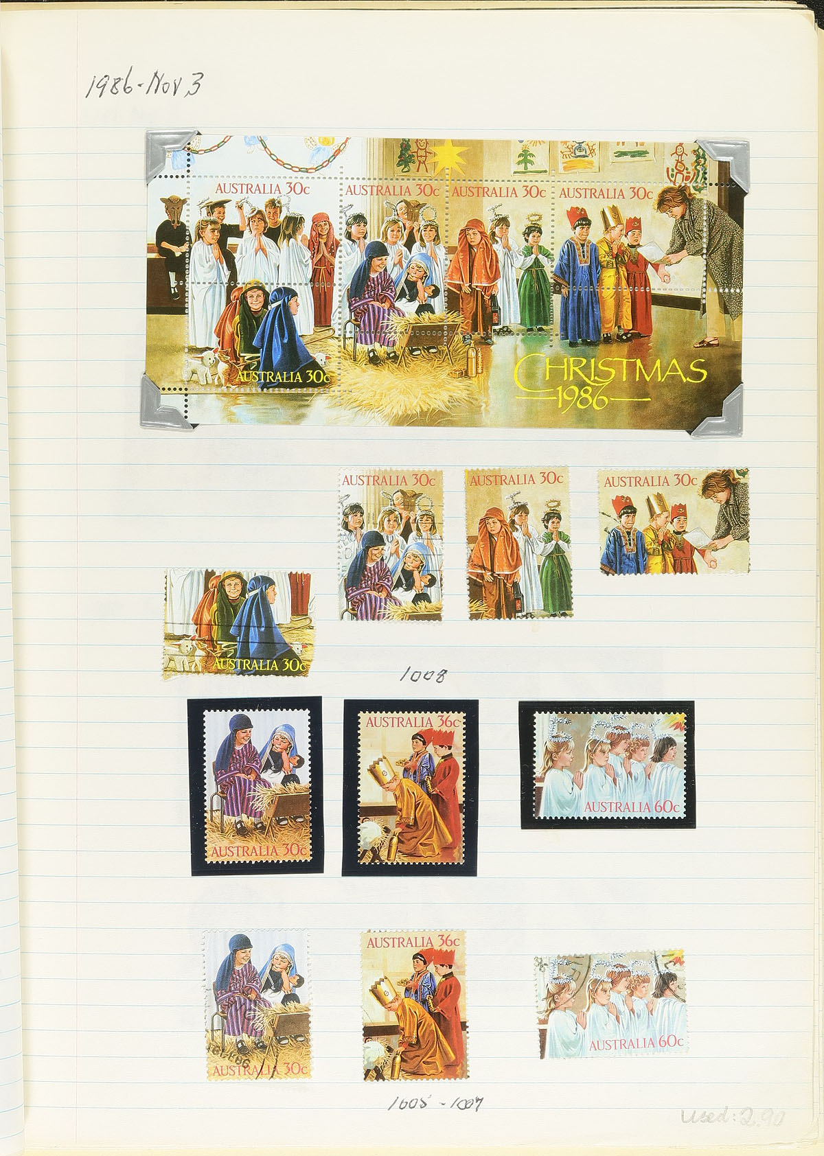 Collection of never hinged and used Australia, 1966-1992, containing over 1,350 stamps in many homemade pages. This nicely organized collection ranges from Scott #394/1261, containing primarily sets, with used material hinged onto pages, and mint material primarily in hingeless mounts and in a few photo corners. The owner's older Scott catalogue for the used material only catalogue US$507.00, and face value totals AUD$240.00, leaving room for a higher catalogue value once the mint is accounted for. A nice starter lot from this popular collecting country, overall fine to very fine. Estimate =