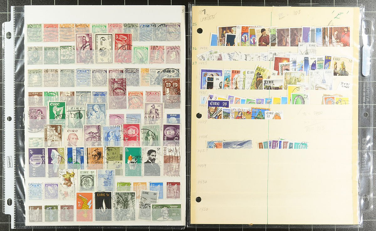 Accumulation of used Ireland, 1922-2009, containing a few thousand stamps in roughly 20 stock pages. The lot generally ranges from Scott #1/1832, including several sets, and a few back of the book issues, noting a few sets cataloguing $10 and up. A nice lot for collectors and dealers, and especially topical / thematic enthusiasts as we spotted a number of suitable subjects. Overall fine to very fine. Owner's 2019 Scott US$1,716.00 =