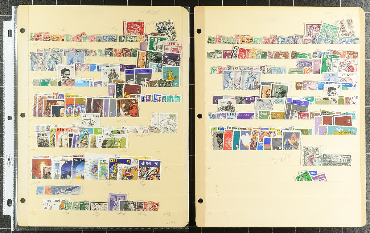 Accumulation of used Ireland, 1922-2009, containing a few thousand stamps in roughly 20 stock pages. The lot generally ranges from Scott #1/1832, including several sets, and a few back of the book issues, noting a few sets cataloguing $10 and up. A nice lot for collectors and dealers, and especially topical / thematic enthusiasts as we spotted a number of suitable subjects. Overall fine to very fine. Owner's 2019 Scott US$1,716.00 =