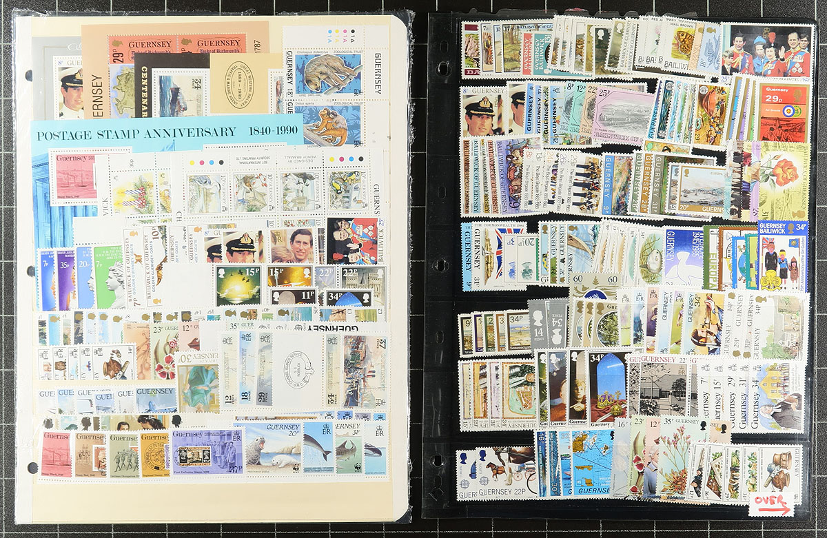 Collection / accumulation of primarily never hinged Guernsey, 1958-2005, containing many hundreds of stamps in over 20 stock pages. The lot generally ranges from Scott #8/874, containing many sets, along with booklets, souvenir sheets, and booklet panes. Some of the material catalogues $10 and up, with the owner's 2018 Scott catalogue value for the lot totaling US$1,196.00. A nice clean lot for all collectors. Estimate =