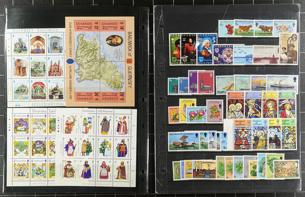 Collection / accumulation of primarily never hinged Guernsey, 1958-2005, containing many hundreds of stamps in over 20 stock pages. The lot generally ranges from Scott #8/874, containing many sets, along with booklets, souvenir sheets, and booklet panes. Some of the material catalogues $10 and up, with the owner's 2018 Scott catalogue value for the lot totaling US$1,196.00. A nice clean lot for all collectors. Estimate =