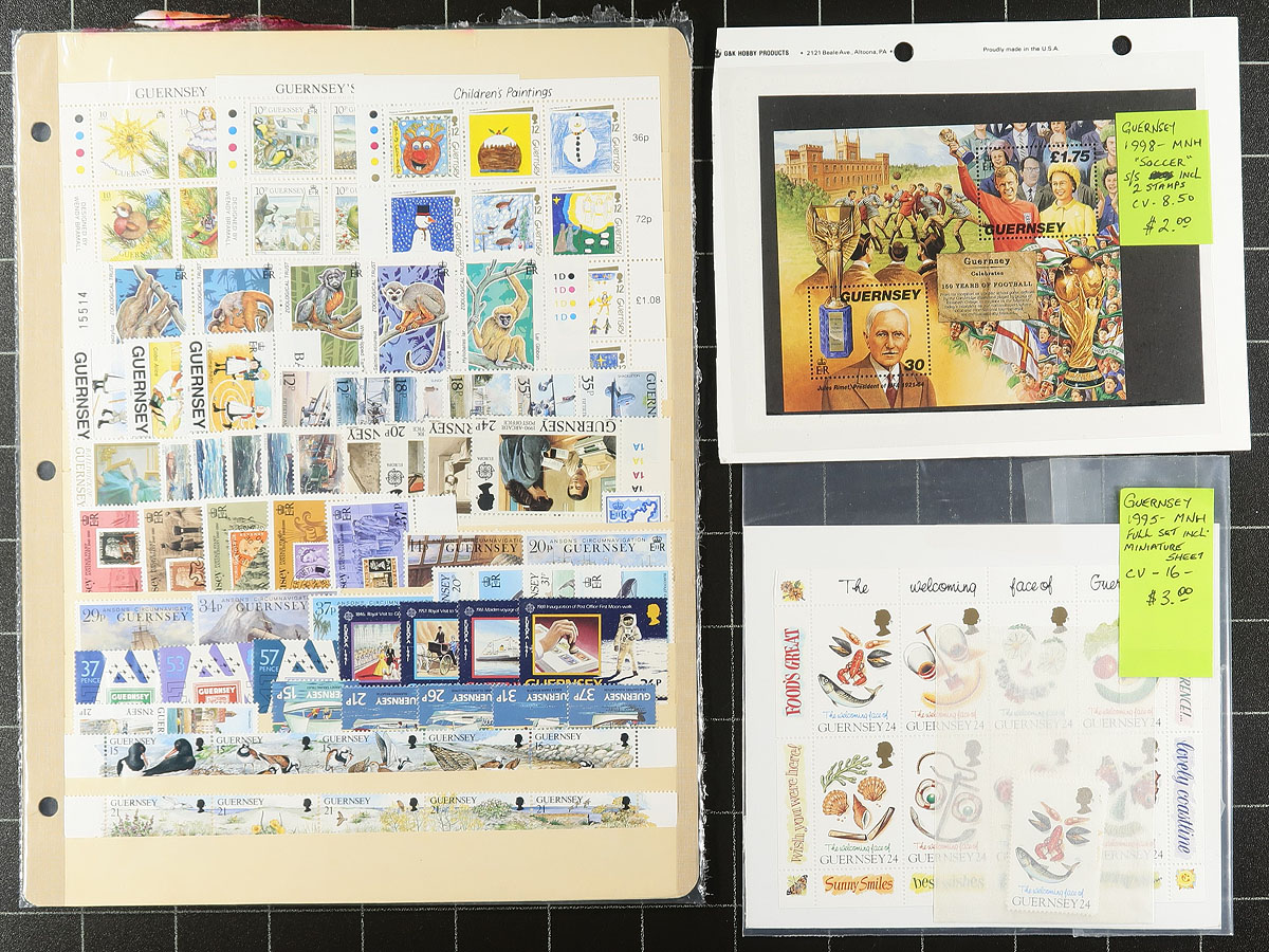 Collection / accumulation of primarily never hinged Guernsey, 1958-2005, containing many hundreds of stamps in over 20 stock pages. The lot generally ranges from Scott #8/874, containing many sets, along with booklets, souvenir sheets, and booklet panes. Some of the material catalogues $10 and up, with the owner's 2018 Scott catalogue value for the lot totaling US$1,196.00. A nice clean lot for all collectors. Estimate =