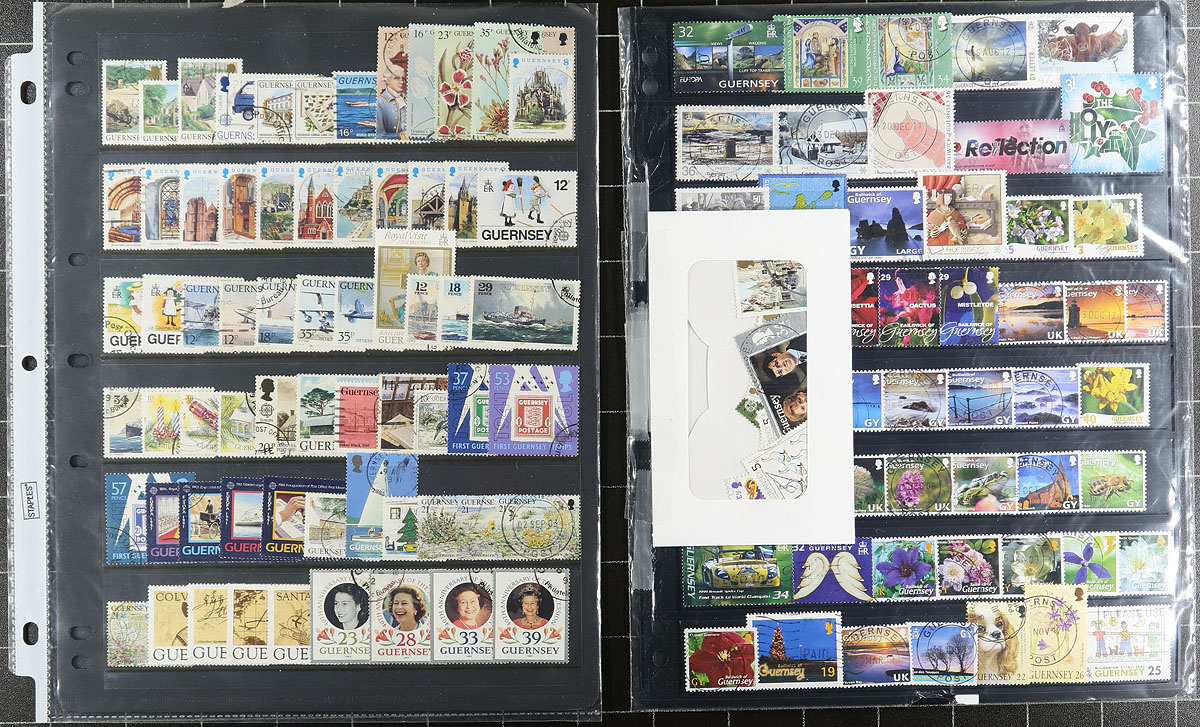 Collection / accumulation of used Guernsey, 1969-2015, containing many hundreds of stamps in many stock pages and a small stockbook. The lot generally ranges from Scott #8/1281, containing singles and a few sets (all appearing to have cto cancels), with some material cataloguing $5 and up. Owner's 2015 Scott catalogue value for the lot totals US$1,557.00. A nice lot for all collectors as used material is offered less often as mint material, overall fine to very fine. Estimate =