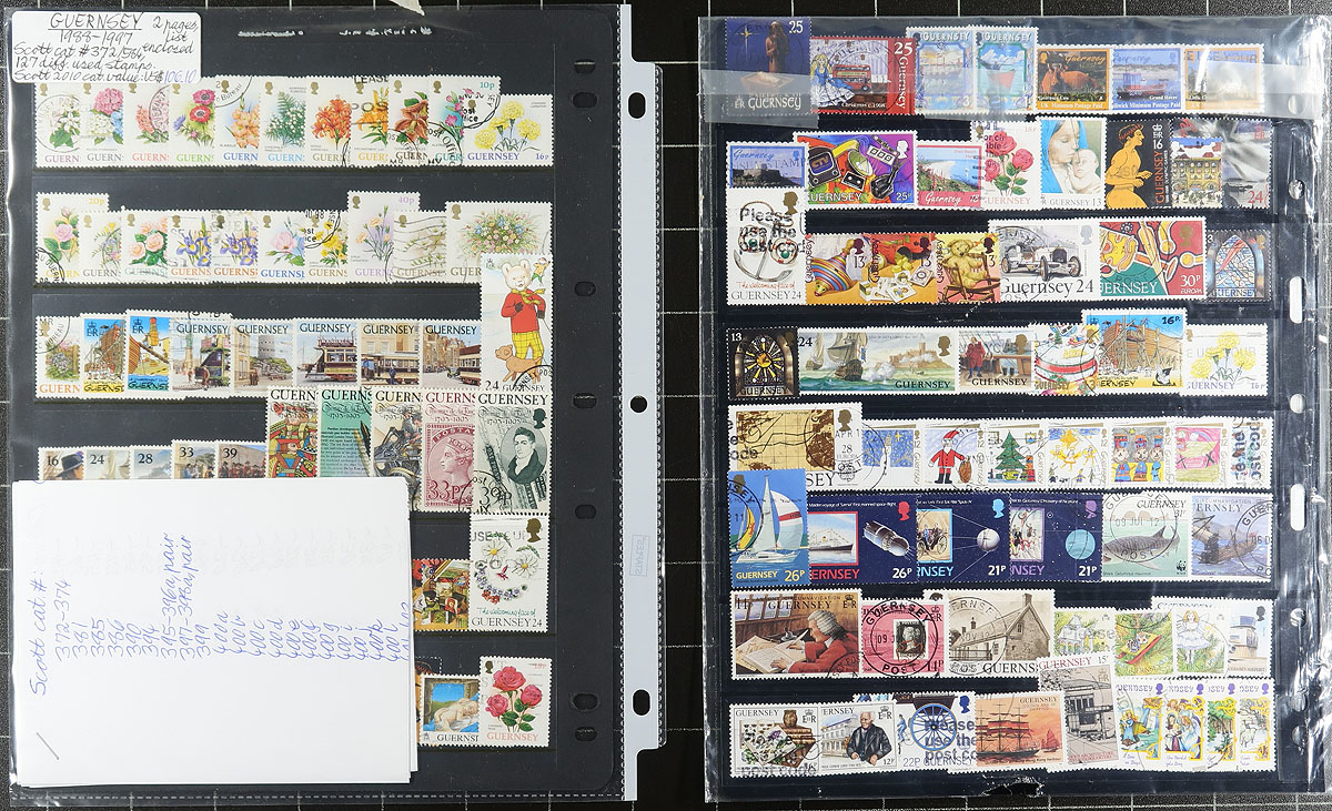 Collection / accumulation of used Guernsey, 1969-2015, containing many hundreds of stamps in many stock pages and a small stockbook. The lot generally ranges from Scott #8/1281, containing singles and a few sets (all appearing to have cto cancels), with some material cataloguing $5 and up. Owner's 2015 Scott catalogue value for the lot totals US$1,557.00. A nice lot for all collectors as used material is offered less often as mint material, overall fine to very fine. Estimate =