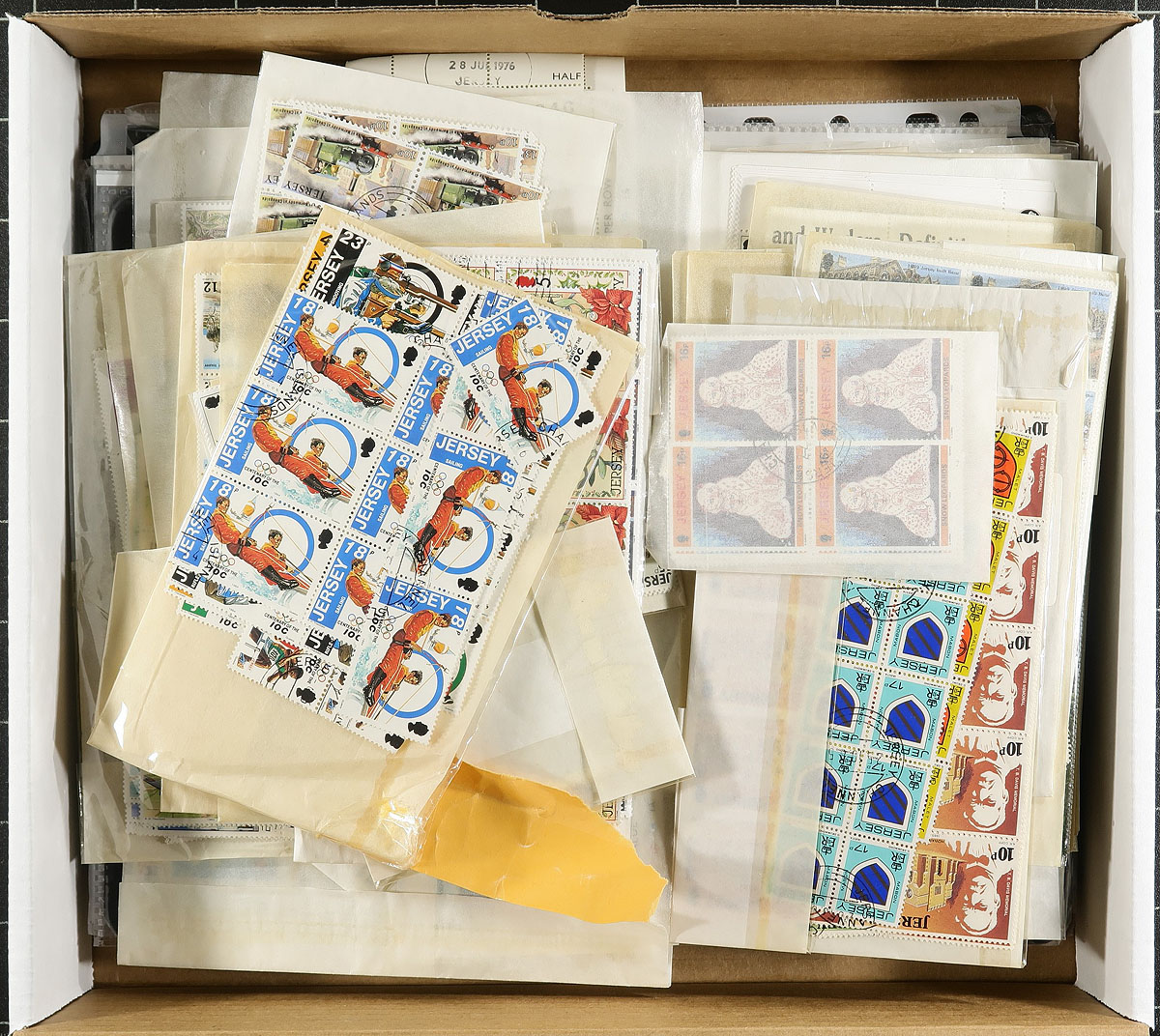 Collection and stock of used Jersey, 1970-1999, containing a few thousand stamps in several stock pages and glassines. The lot generally ranges from Scott #34/932, noting singles, sets, and several blocks (almost all in glassines), with some material cataloguing $5 and up. Owner's 2013 Scott catalogue value for the lot totals US$1,984.00. A nice lot as used material is offered less frequently than mint stamps. Duplication ranges up to 10 for some issues, with almost all material appearing to have cto cancels, overall fine to very fine. Estimate =