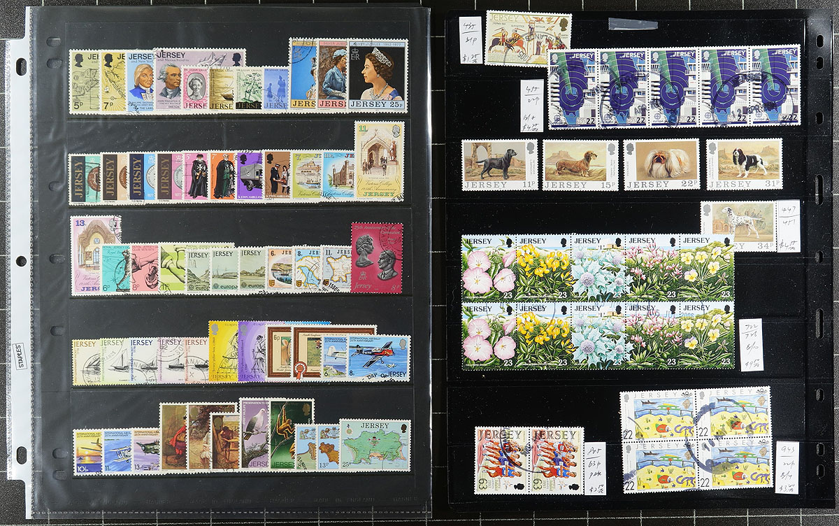 Collection and stock of used Jersey, 1970-1999, containing a few thousand stamps in several stock pages and glassines. The lot generally ranges from Scott #34/932, noting singles, sets, and several blocks (almost all in glassines), with some material cataloguing $5 and up. Owner's 2013 Scott catalogue value for the lot totals US$1,984.00. A nice lot as used material is offered less frequently than mint stamps. Duplication ranges up to 10 for some issues, with almost all material appearing to have cto cancels, overall fine to very fine. Estimate =