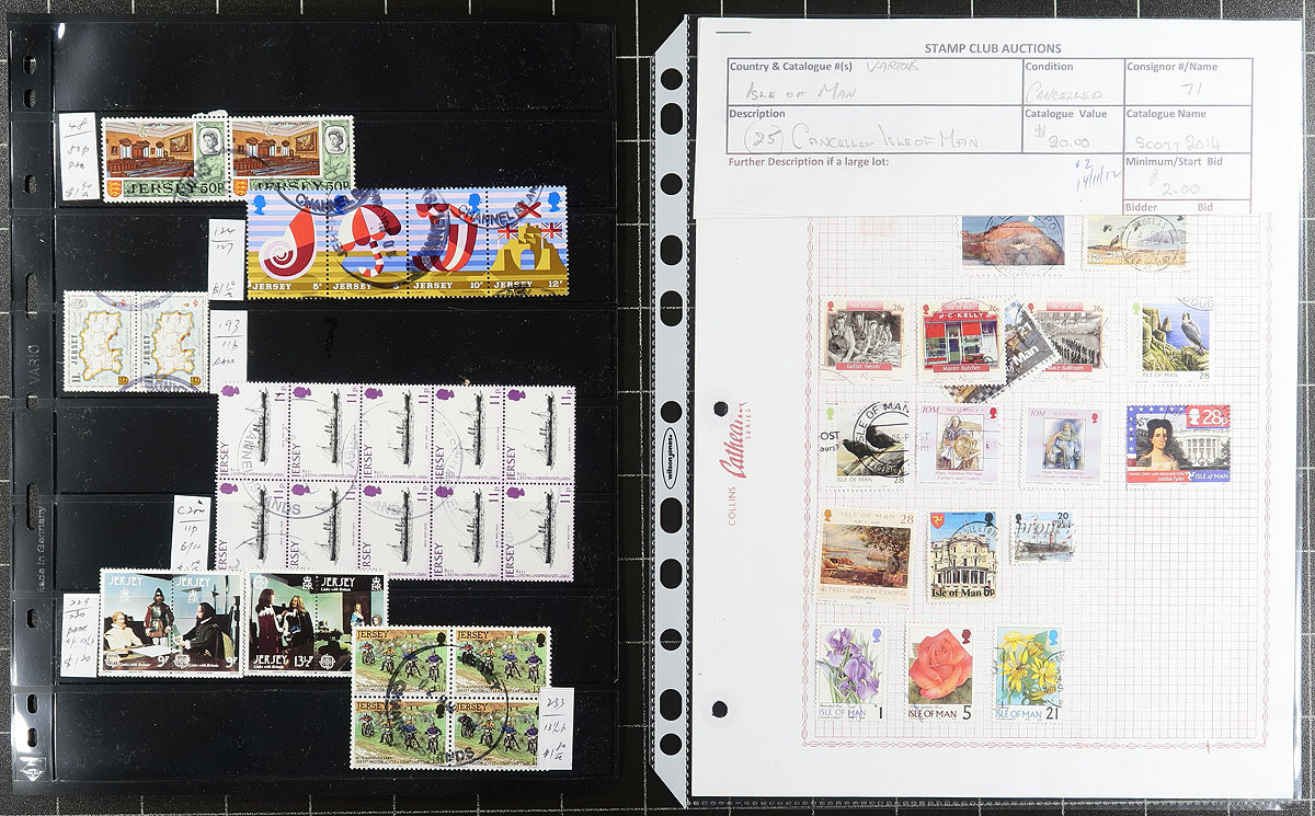 Collection and stock of used Jersey, 1970-1999, containing a few thousand stamps in several stock pages and glassines. The lot generally ranges from Scott #34/932, noting singles, sets, and several blocks (almost all in glassines), with some material cataloguing $5 and up. Owner's 2013 Scott catalogue value for the lot totals US$1,984.00. A nice lot as used material is offered less frequently than mint stamps. Duplication ranges up to 10 for some issues, with almost all material appearing to have cto cancels, overall fine to very fine. Estimate =