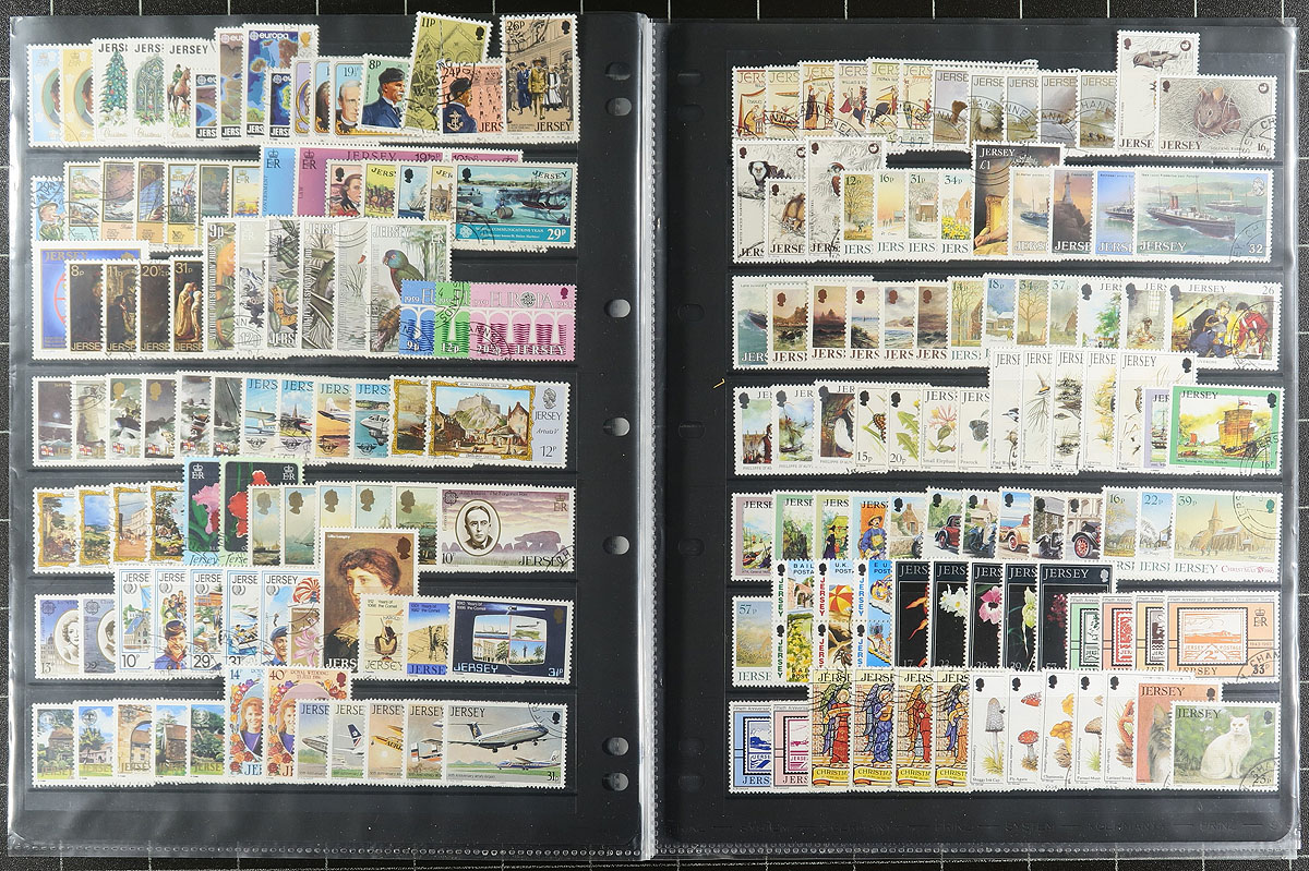 Collection and stock of used Jersey, 1970-1999, containing a few thousand stamps in several stock pages and glassines. The lot generally ranges from Scott #34/932, noting singles, sets, and several blocks (almost all in glassines), with some material cataloguing $5 and up. Owner's 2013 Scott catalogue value for the lot totals US$1,984.00. A nice lot as used material is offered less frequently than mint stamps. Duplication ranges up to 10 for some issues, with almost all material appearing to have cto cancels, overall fine to very fine. Estimate =