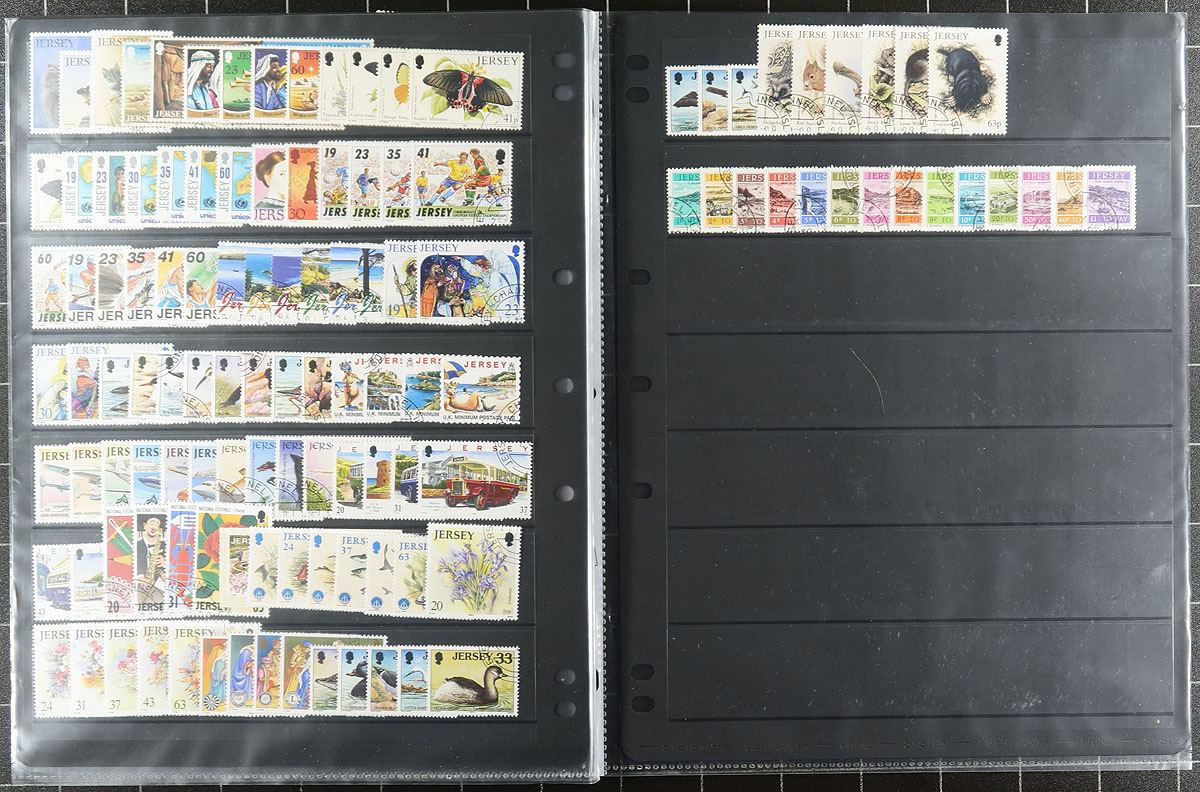 Collection and stock of used Jersey, 1970-1999, containing a few thousand stamps in several stock pages and glassines. The lot generally ranges from Scott #34/932, noting singles, sets, and several blocks (almost all in glassines), with some material cataloguing $5 and up. Owner's 2013 Scott catalogue value for the lot totals US$1,984.00. A nice lot as used material is offered less frequently than mint stamps. Duplication ranges up to 10 for some issues, with almost all material appearing to have cto cancels, overall fine to very fine. Estimate =