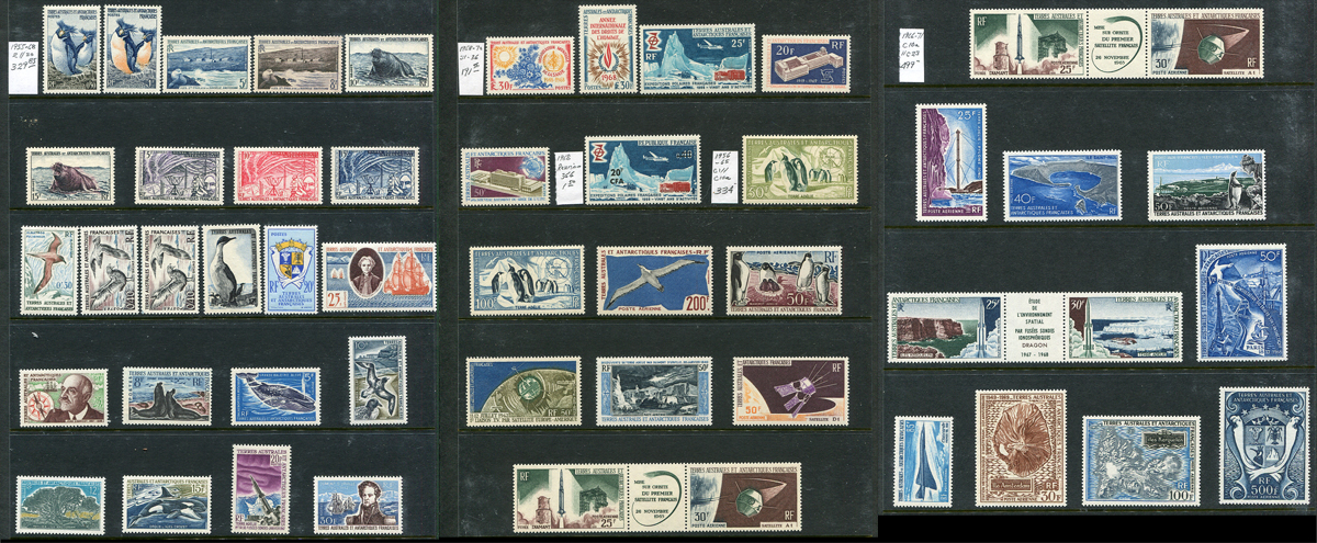 A high-powered mint Never Hinged selection of 50 stamps (including Reunion #366, the "joint issue" to a matching FSAT issue) from the 1955-1971 period. These often high-value, large format stamps have long been admired by Topical Collectors, for the wide-range of interesting topics depicted (noted Sea Life, Animals, Ships, Penguins, Space etc). The catalogue value adds up quickly here! 2026 Scott US1,354.35 =