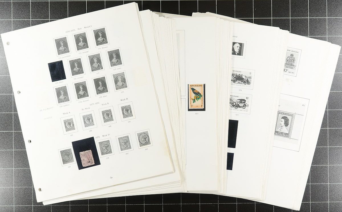 Balance of mint and primarily used New Zealand issues, 1880's-1990's, containing many hundreds of stamps in a variety of formats including stock and album pages, a Stanley Gibbons album (fairly picked through), and collector packs. The lot generally ranges from Scott #61/1092, containing a variety of material including singles, sets, souvenir sheets, semi-postals and other back of the book issues, varieties, etc. A cursory check indicated some material cataloguing $10 and up, including C4 (used), C5 (mh, c.v. $75 total). Some of the material has been catalogued by the owner using a 2008 Scott catalogue totaling US$561.00, leaving value for collectors. A few small faults with a few of the early issues, overall fine to very fine. Estimate =