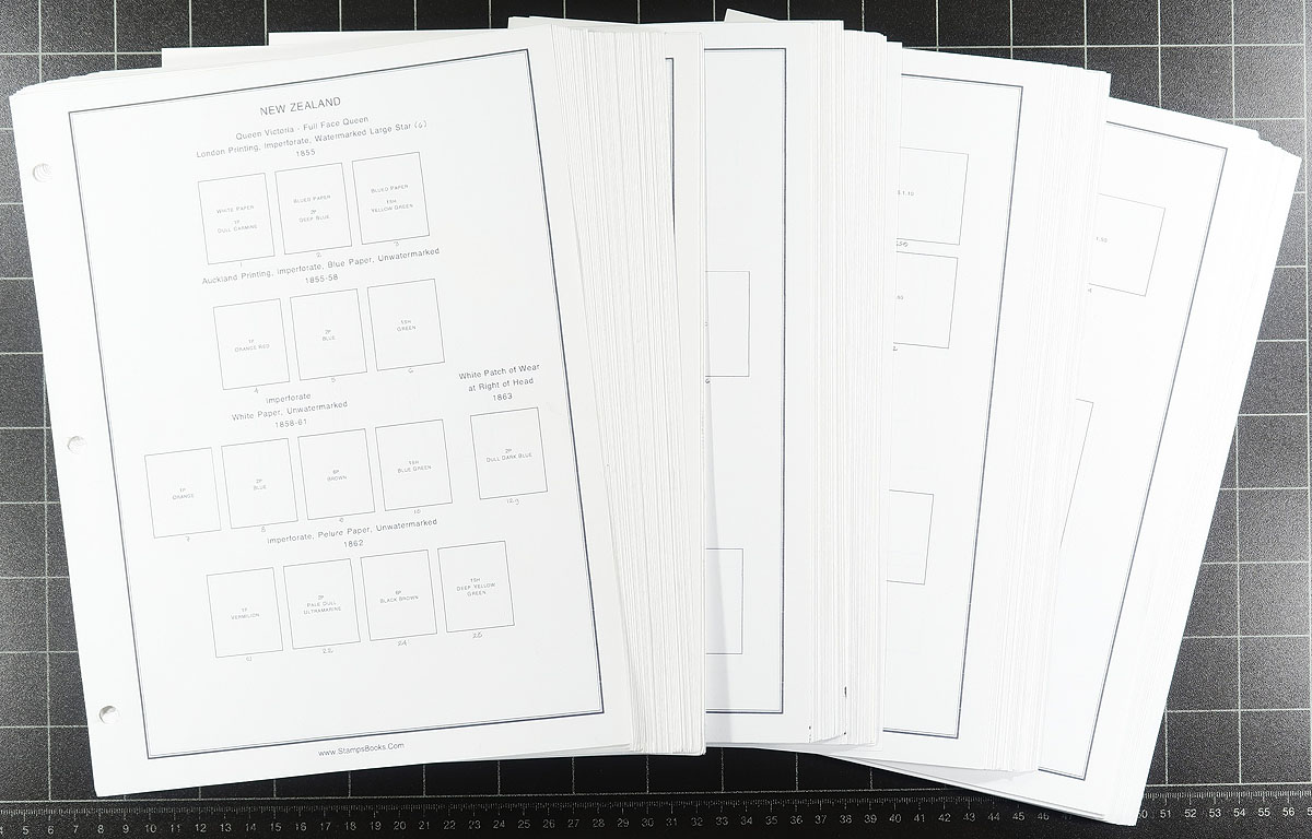 Very useful computerized album pages, ranging from 1855 to 2010, with spaces for regular issues, coils, se-tenent pairs, and souvenir sheets. The lot also includes pages for back of the book issues including fiscals, life insurance, officials, postage dues, airmails, and semi-postals. A lot that would take several hundreds of dollars to duplicate, and ideal for the New Zealand or Commonwealth collector to set up a clean collection. Estimate =