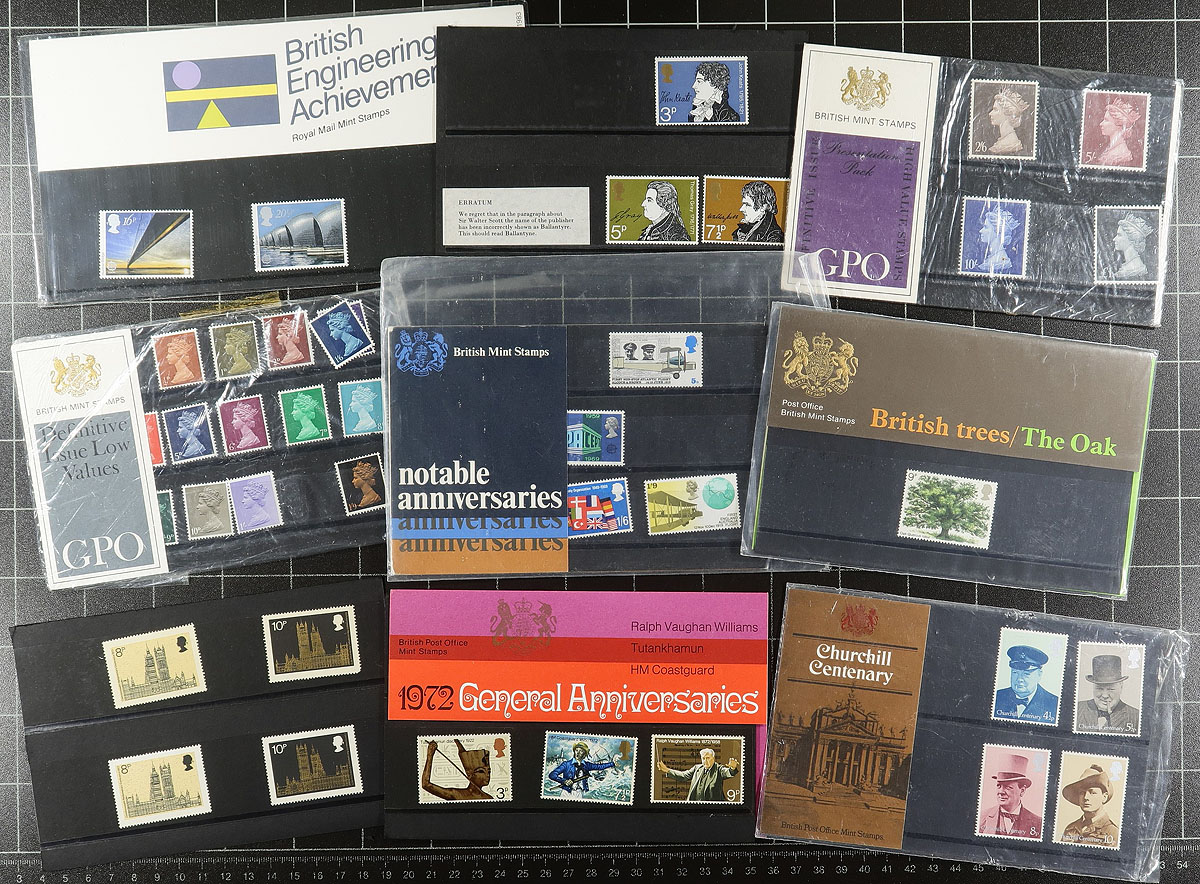 Balance of mint and primarily used Great Britain issues, 1911-1990's, containing a few thousand stamps in a variety of formats including several album or stock pages, presentation packs, small books, and more. The lot generally ranges from Scott #151/1838, containing singles, sets, back of the book issues, varieties and more. A cursory check indicated accumulations of mainly KGVI and Elizabethan issues, including several homemade books containing specialized collection of individual 1960's issues highlighting shade, and small varieties, a small selection of Seahorse issues, roughly 30 presentation packs (mostly from the 1970's), and more, noting some issues cataloguing $10 and up. Overall fine to very fine. Estimate =