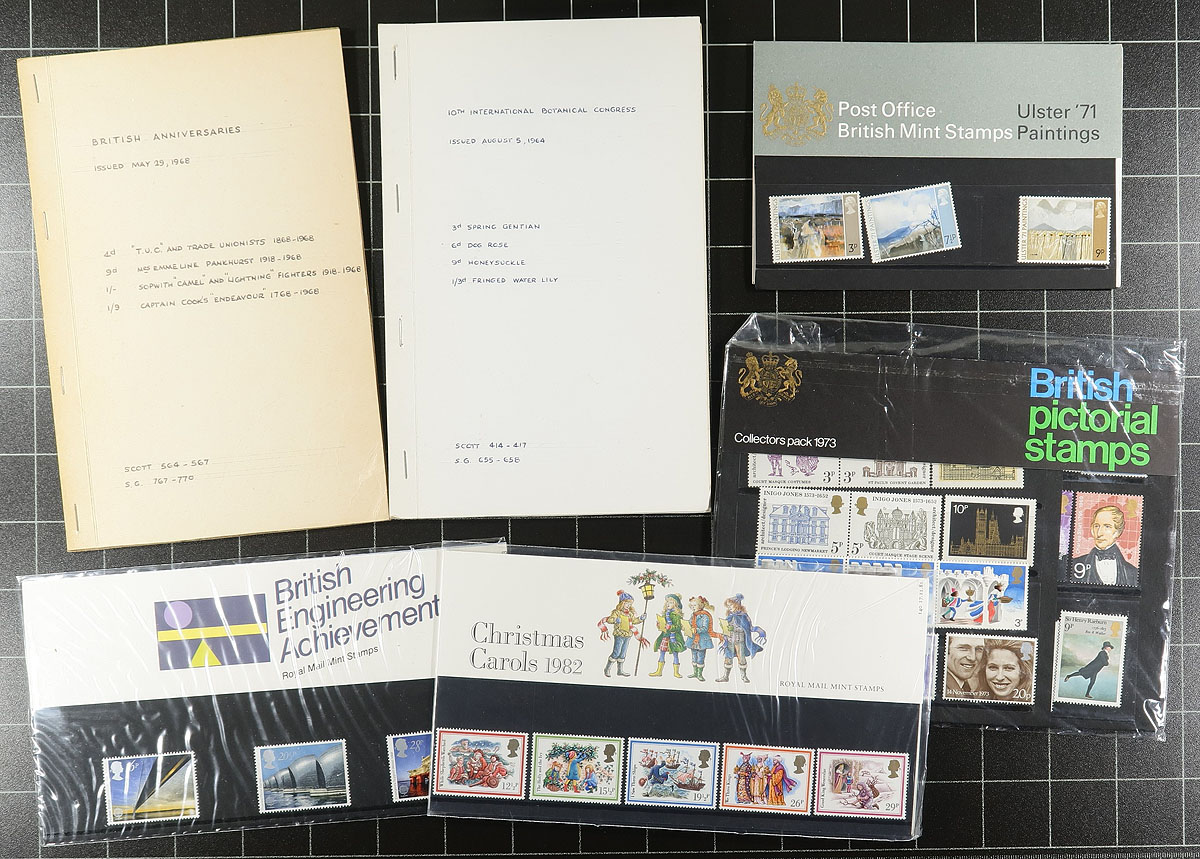 Balance of mint and primarily used Great Britain issues, 1911-1990's, containing a few thousand stamps in a variety of formats including several album or stock pages, presentation packs, small books, and more. The lot generally ranges from Scott #151/1838, containing singles, sets, back of the book issues, varieties and more. A cursory check indicated accumulations of mainly KGVI and Elizabethan issues, including several homemade books containing specialized collection of individual 1960's issues highlighting shade, and small varieties, a small selection of Seahorse issues, roughly 30 presentation packs (mostly from the 1970's), and more, noting some issues cataloguing $10 and up. Overall fine to very fine. Estimate =