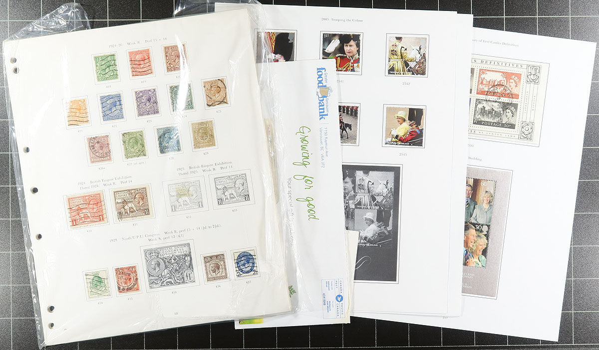Balance of mint and primarily used Great Britain issues, 1911-1990's, containing a few thousand stamps in a variety of formats including several album or stock pages, presentation packs, small books, and more. The lot generally ranges from Scott #151/1838, containing singles, sets, back of the book issues, varieties and more. A cursory check indicated accumulations of mainly KGVI and Elizabethan issues, including several homemade books containing specialized collection of individual 1960's issues highlighting shade, and small varieties, a small selection of Seahorse issues, roughly 30 presentation packs (mostly from the 1970's), and more, noting some issues cataloguing $10 and up. Overall fine to very fine. Estimate =