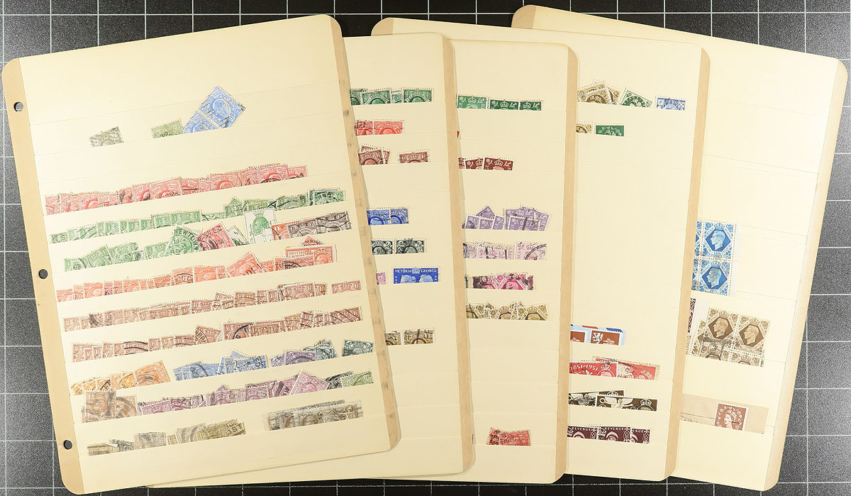 Balance of mint and primarily used Great Britain issues, 1911-1990's, containing a few thousand stamps in a variety of formats including several album or stock pages, presentation packs, small books, and more. The lot generally ranges from Scott #151/1838, containing singles, sets, back of the book issues, varieties and more. A cursory check indicated accumulations of mainly KGVI and Elizabethan issues, including several homemade books containing specialized collection of individual 1960's issues highlighting shade, and small varieties, a small selection of Seahorse issues, roughly 30 presentation packs (mostly from the 1970's), and more, noting some issues cataloguing $10 and up. Overall fine to very fine. Estimate =