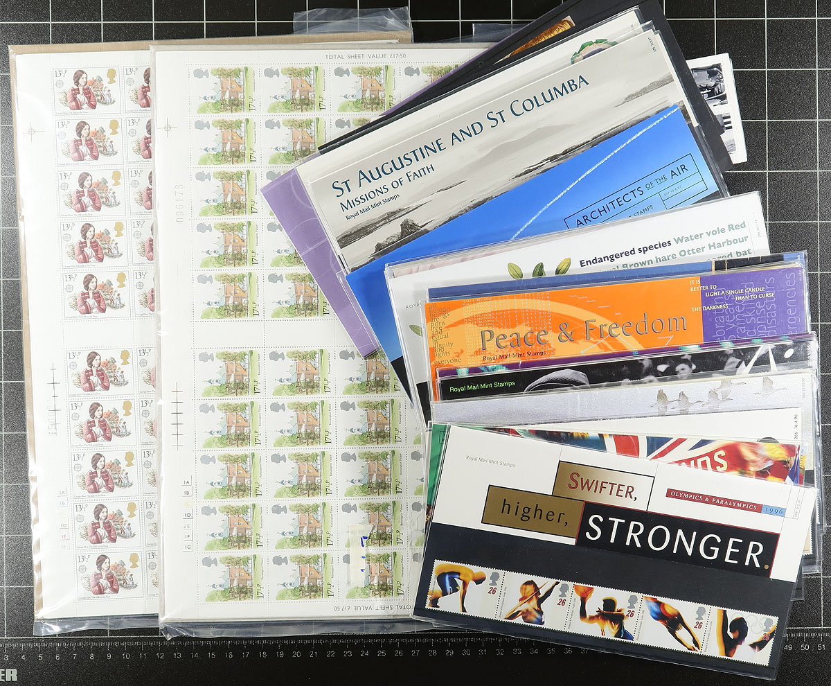 Small group of primarily never hinged Great Britain, including sets of sheets (Scott #s 910-918, all folded), along with roughly 20 presentation packs from the 1990's, and a few other items. Owner's Scott 2019 catalogue value for most of the items totals $330.00, with face value alone totaling £231.00. A nice little lot for mint collectors or postage users. Estimate =