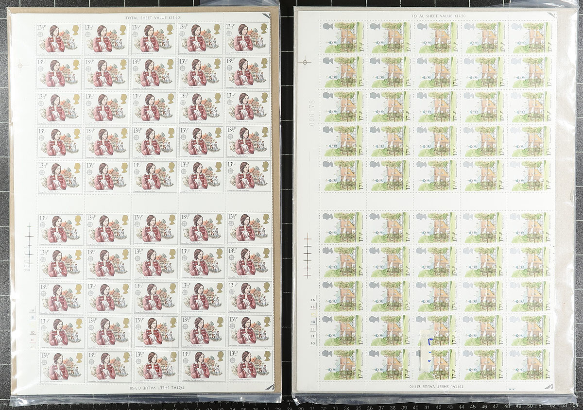 Small group of primarily never hinged Great Britain, including sets of sheets (Scott #s 910-918, all folded), along with roughly 20 presentation packs from the 1990's, and a few other items. Owner's Scott 2019 catalogue value for most of the items totals $330.00, with face value alone totaling £231.00. A nice little lot for mint collectors or postage users. Estimate =