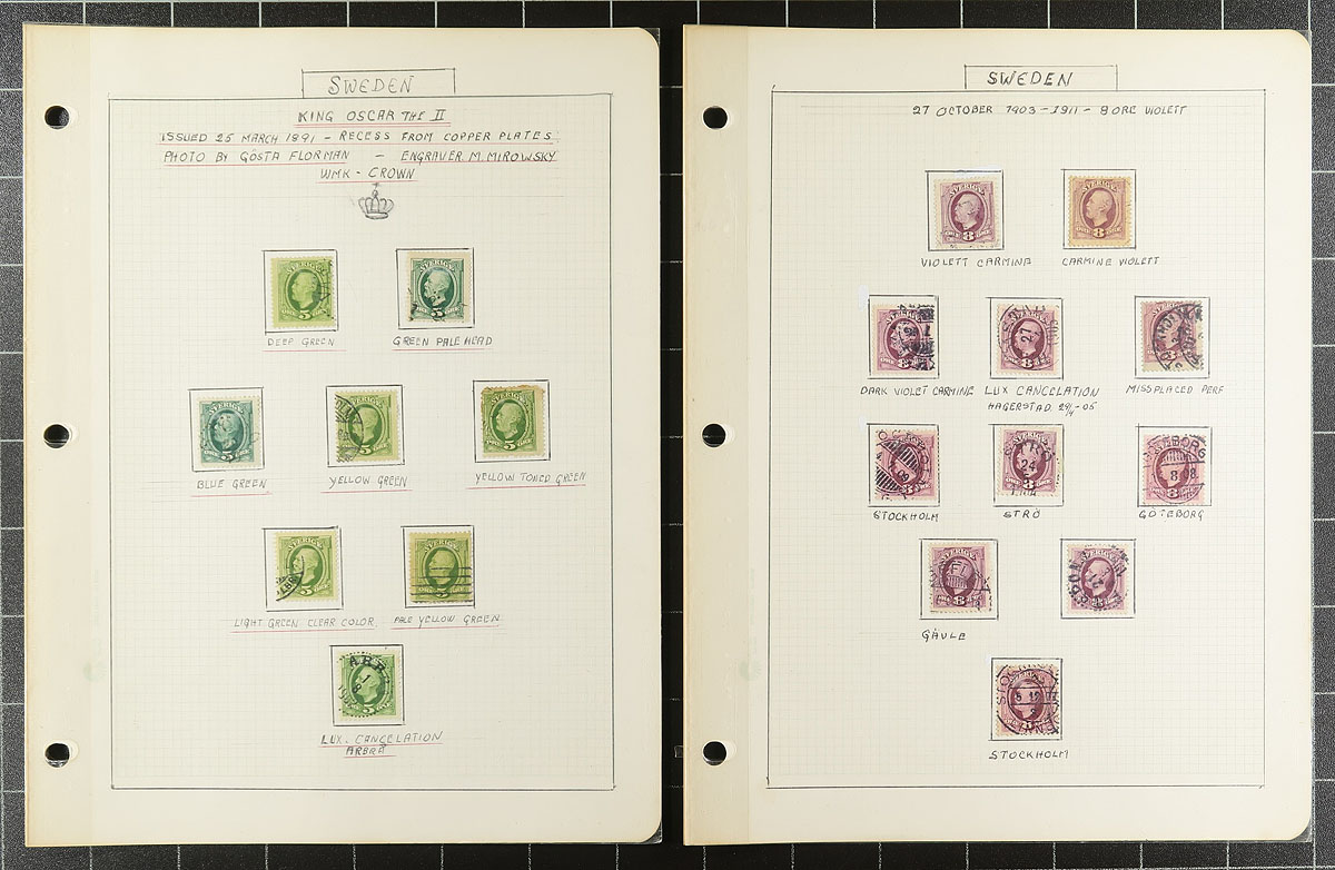 Lovely and comprehensive collection of used King Oscar II issues, 1872-1904, containing many hundreds of stamps on roughly 60 well described homemade pages. This delightful collection is essentially in two halves, the first being shade varieties from the Numeral and King Oscar II issues. The second half dealing with town cancels and types, all identified on pages by the owner, from Stockholm and various Provinces. A spot check indicated some stamps cataloguing $8 to $15 and up each. A lovely collection that should satisfy the Sweden collector, and should be continued and perhaps exhibited. All pages photographed for your viewing pleasure. Estimate =