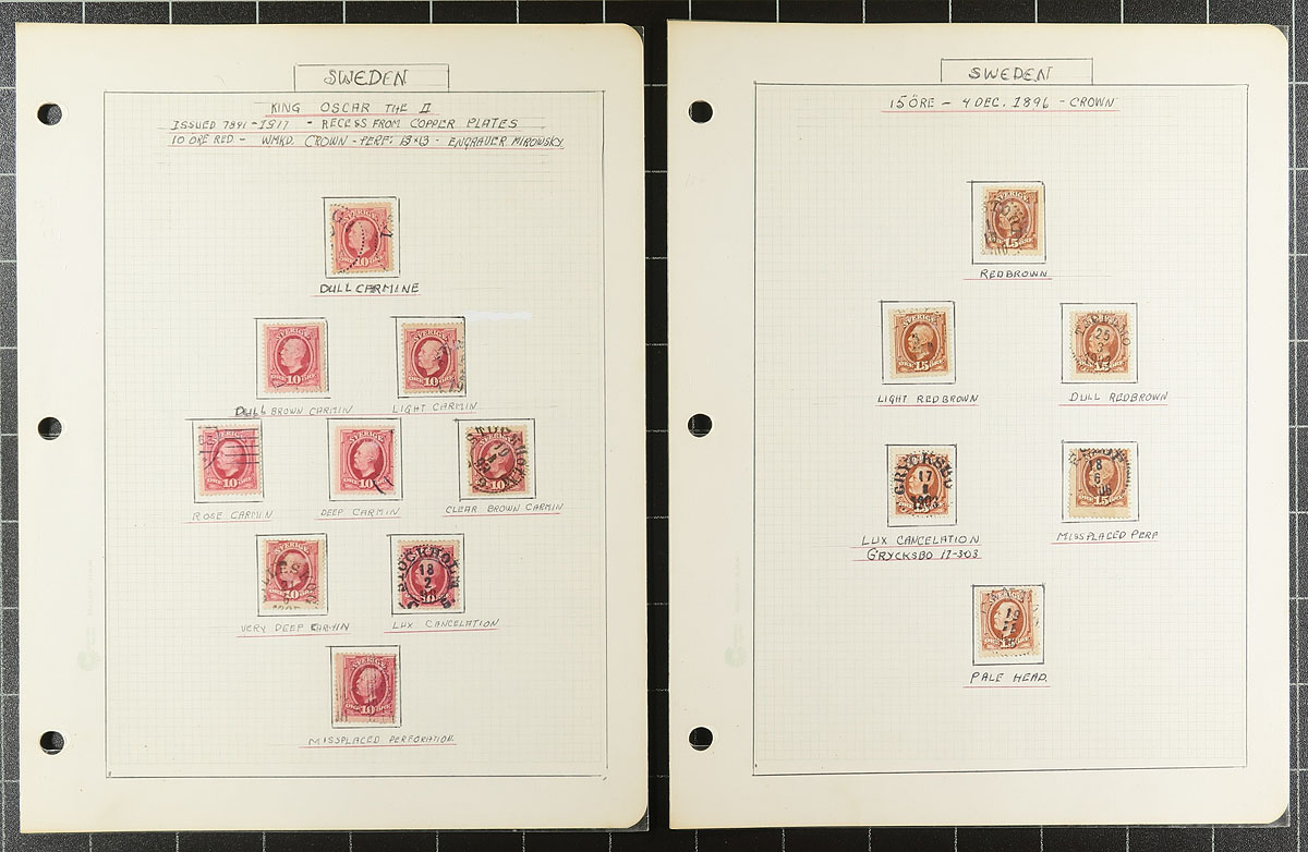Lovely and comprehensive collection of used King Oscar II issues, 1872-1904, containing many hundreds of stamps on roughly 60 well described homemade pages. This delightful collection is essentially in two halves, the first being shade varieties from the Numeral and King Oscar II issues. The second half dealing with town cancels and types, all identified on pages by the owner, from Stockholm and various Provinces. A spot check indicated some stamps cataloguing $8 to $15 and up each. A lovely collection that should satisfy the Sweden collector, and should be continued and perhaps exhibited. All pages photographed for your viewing pleasure. Estimate =