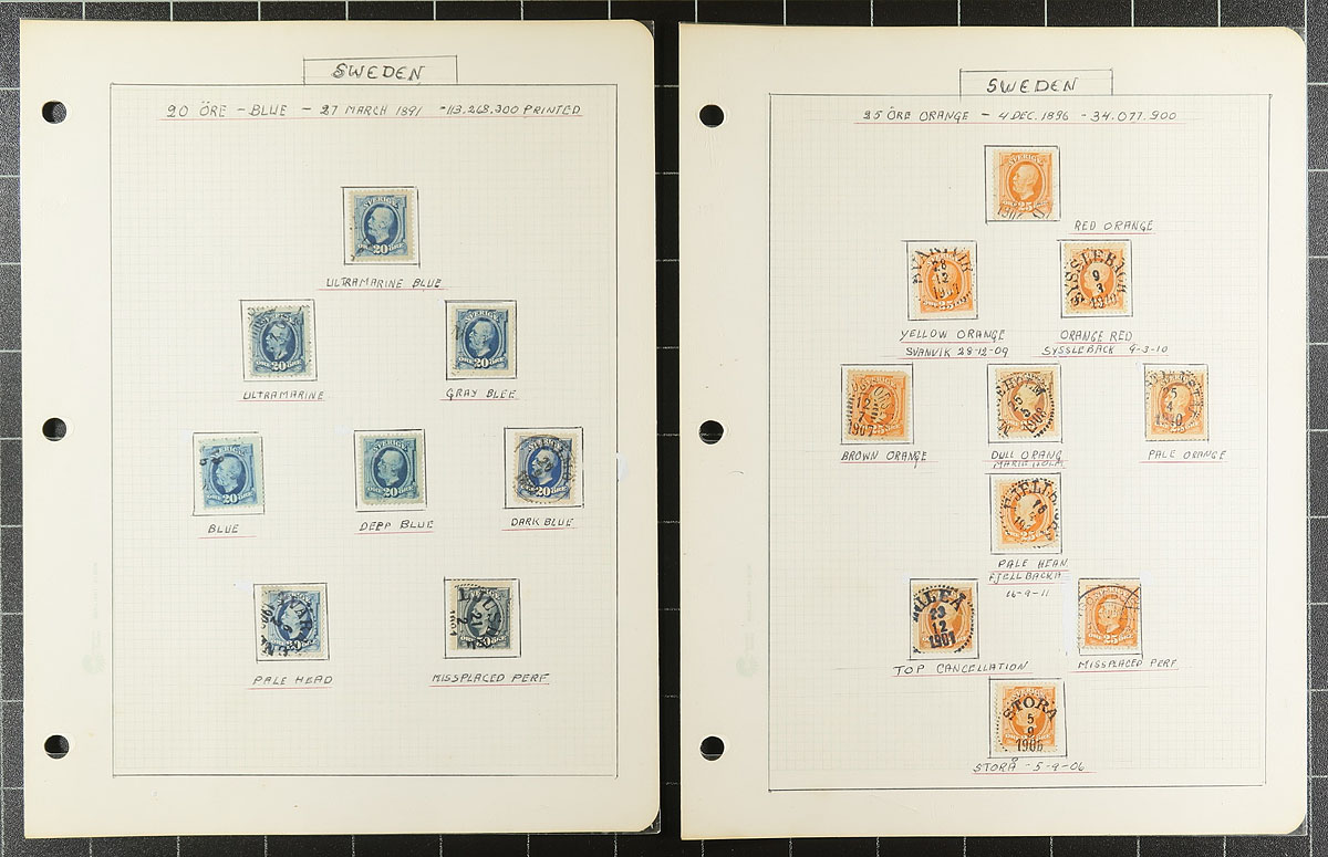 Lovely and comprehensive collection of used King Oscar II issues, 1872-1904, containing many hundreds of stamps on roughly 60 well described homemade pages. This delightful collection is essentially in two halves, the first being shade varieties from the Numeral and King Oscar II issues. The second half dealing with town cancels and types, all identified on pages by the owner, from Stockholm and various Provinces. A spot check indicated some stamps cataloguing $8 to $15 and up each. A lovely collection that should satisfy the Sweden collector, and should be continued and perhaps exhibited. All pages photographed for your viewing pleasure. Estimate =