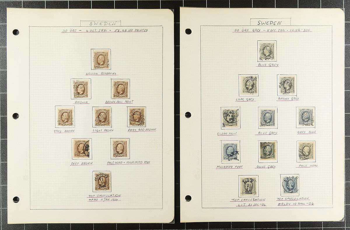 Lovely and comprehensive collection of used King Oscar II issues, 1872-1904, containing many hundreds of stamps on roughly 60 well described homemade pages. This delightful collection is essentially in two halves, the first being shade varieties from the Numeral and King Oscar II issues. The second half dealing with town cancels and types, all identified on pages by the owner, from Stockholm and various Provinces. A spot check indicated some stamps cataloguing $8 to $15 and up each. A lovely collection that should satisfy the Sweden collector, and should be continued and perhaps exhibited. All pages photographed for your viewing pleasure. Estimate =