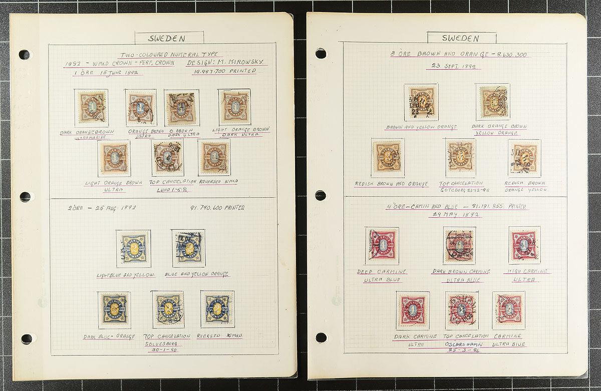 Lovely and comprehensive collection of used King Oscar II issues, 1872-1904, containing many hundreds of stamps on roughly 60 well described homemade pages. This delightful collection is essentially in two halves, the first being shade varieties from the Numeral and King Oscar II issues. The second half dealing with town cancels and types, all identified on pages by the owner, from Stockholm and various Provinces. A spot check indicated some stamps cataloguing $8 to $15 and up each. A lovely collection that should satisfy the Sweden collector, and should be continued and perhaps exhibited. All pages photographed for your viewing pleasure. Estimate =
